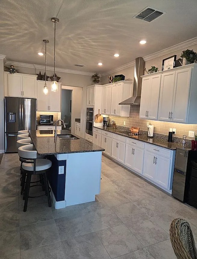 The gourmet kitchen features granite countertops, tile backsplash, crown-topped cabinets with under-cabinet lighting, and upgraded appliances, including a French-door refrigerator.