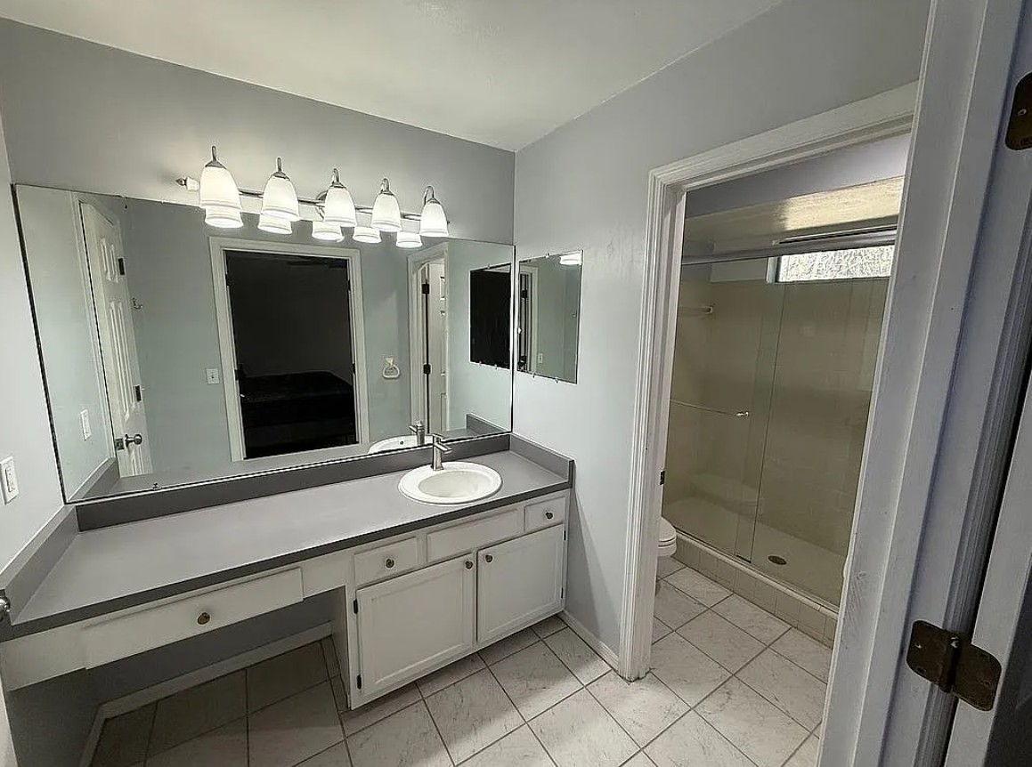 Upstairs, the spacious primary bedroom includes a generously sized closet and a private bathroom with a walk-in shower.