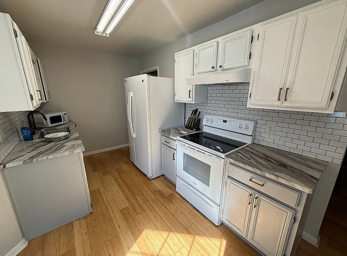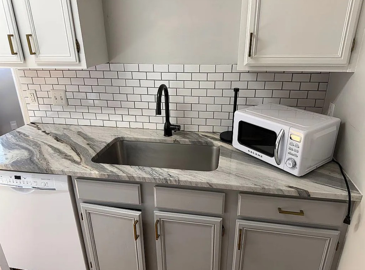 The kitchen is thoughtfully designed with marble countertops and painted wood cabinetry, creating a bright and functional space for everyday living.