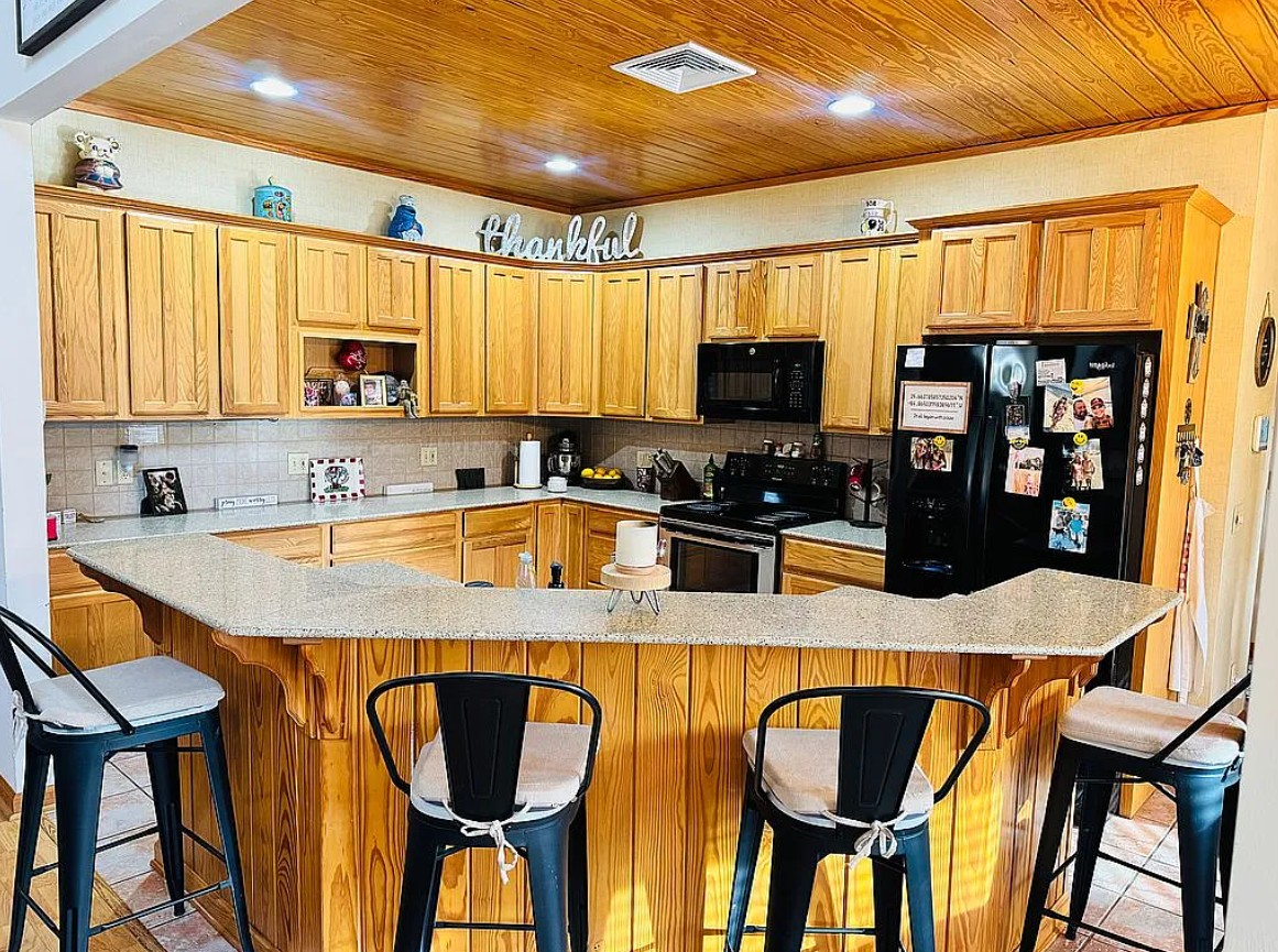 The stunning kitchen features tongue-and-groove pine ceilings, solid oak cabinets, Silestone countertops, and GE Profile appliances (2021 or newer), combining timeless craftsmanship with modern convenience.