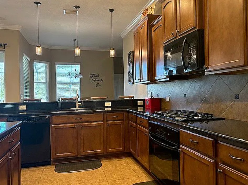 The expansive kitchen features granite countertops, abundant cabinetry, a pantry, gas cooktop, and a casual dining area, ideal for family gatherings or entertaining guests.