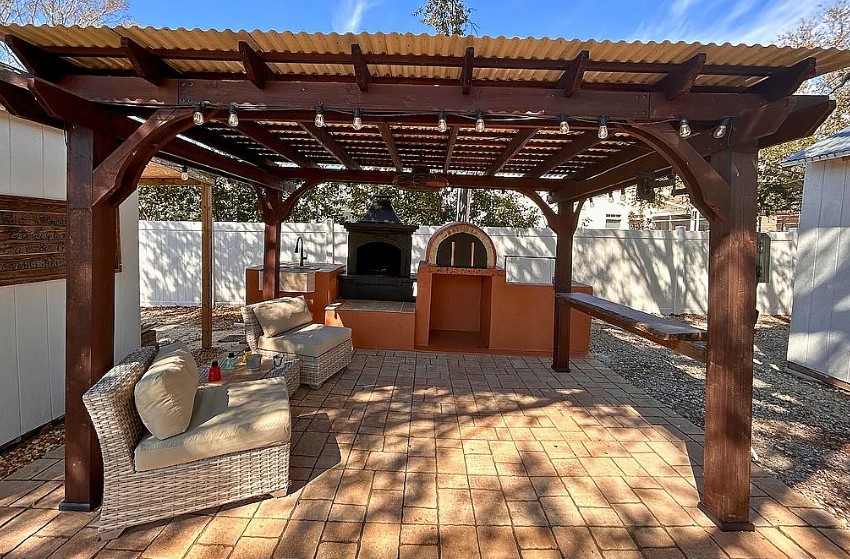 The backyard is an entertainer’s dream with a screened saltwater pool, spacious sun deck, firepit area, custom pizza oven, and outdoor grilling station perfect for year-round Florida living.