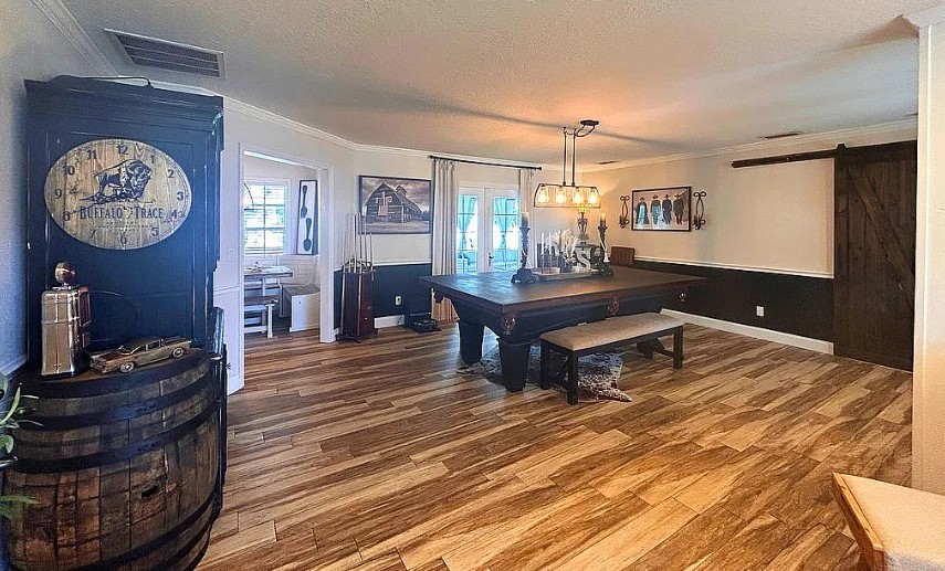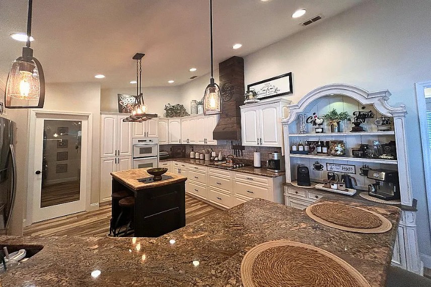 The remodeled primary suite (2023) offers French doors to the pool, double vanity, built in beauty station, large walk-in shower, and custom oak shelving.