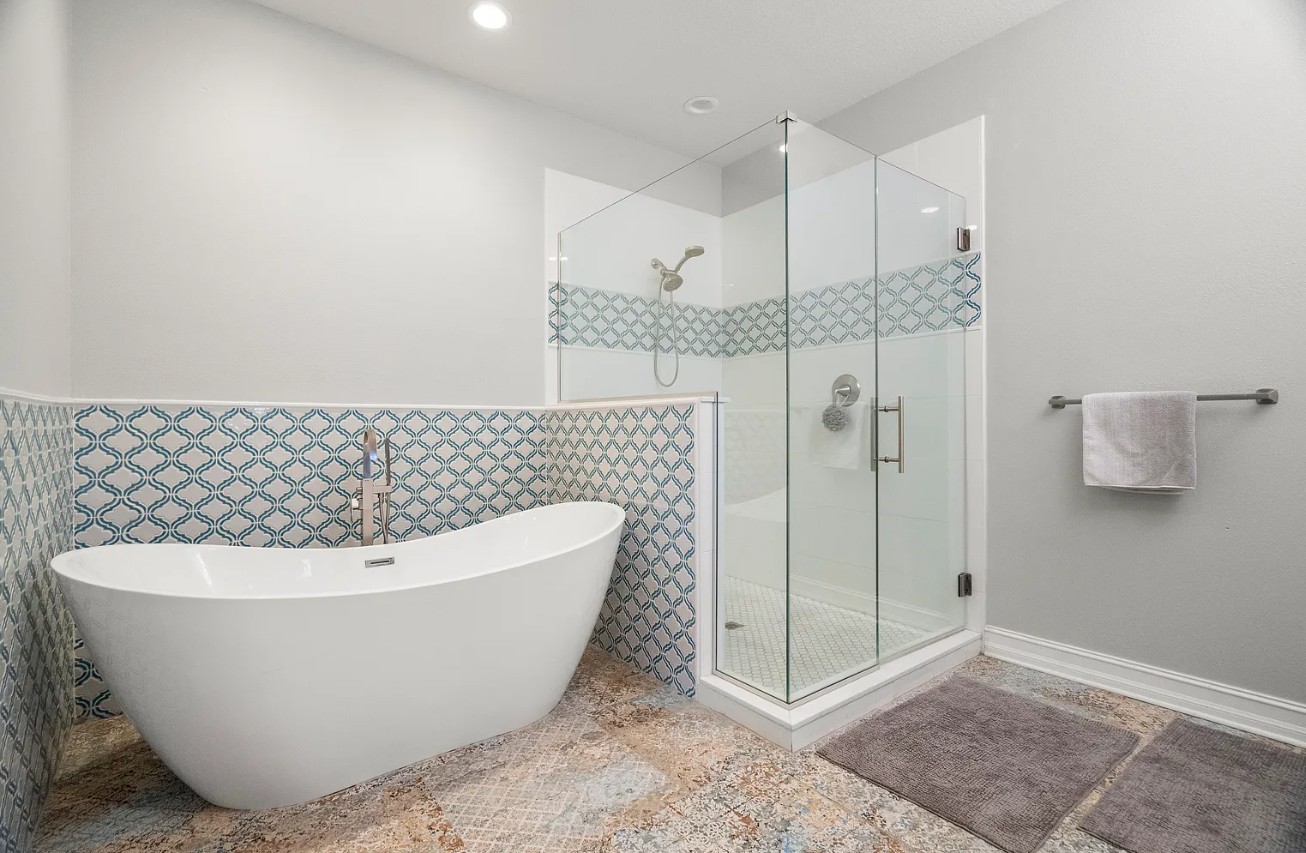 The upgraded primary bathroom features dual vanities, a freestanding soaking tub, linen closet, and a frameless glass shower.
