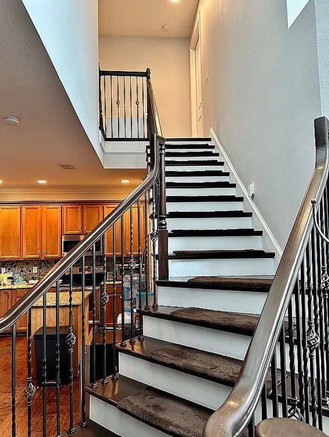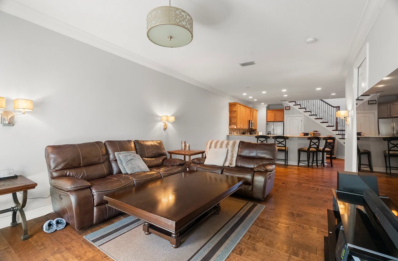 Engineered hardwood floors flow throughout the main living areas, complementing the sophisticated staircase.