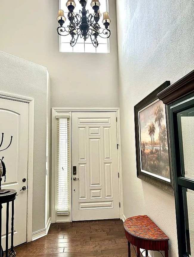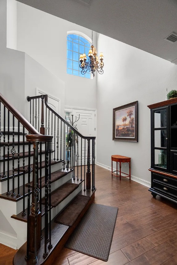 Step into the grand foyer with soaring 22 foot ceilings and an elegant wood-and-wrought-iron staircase.