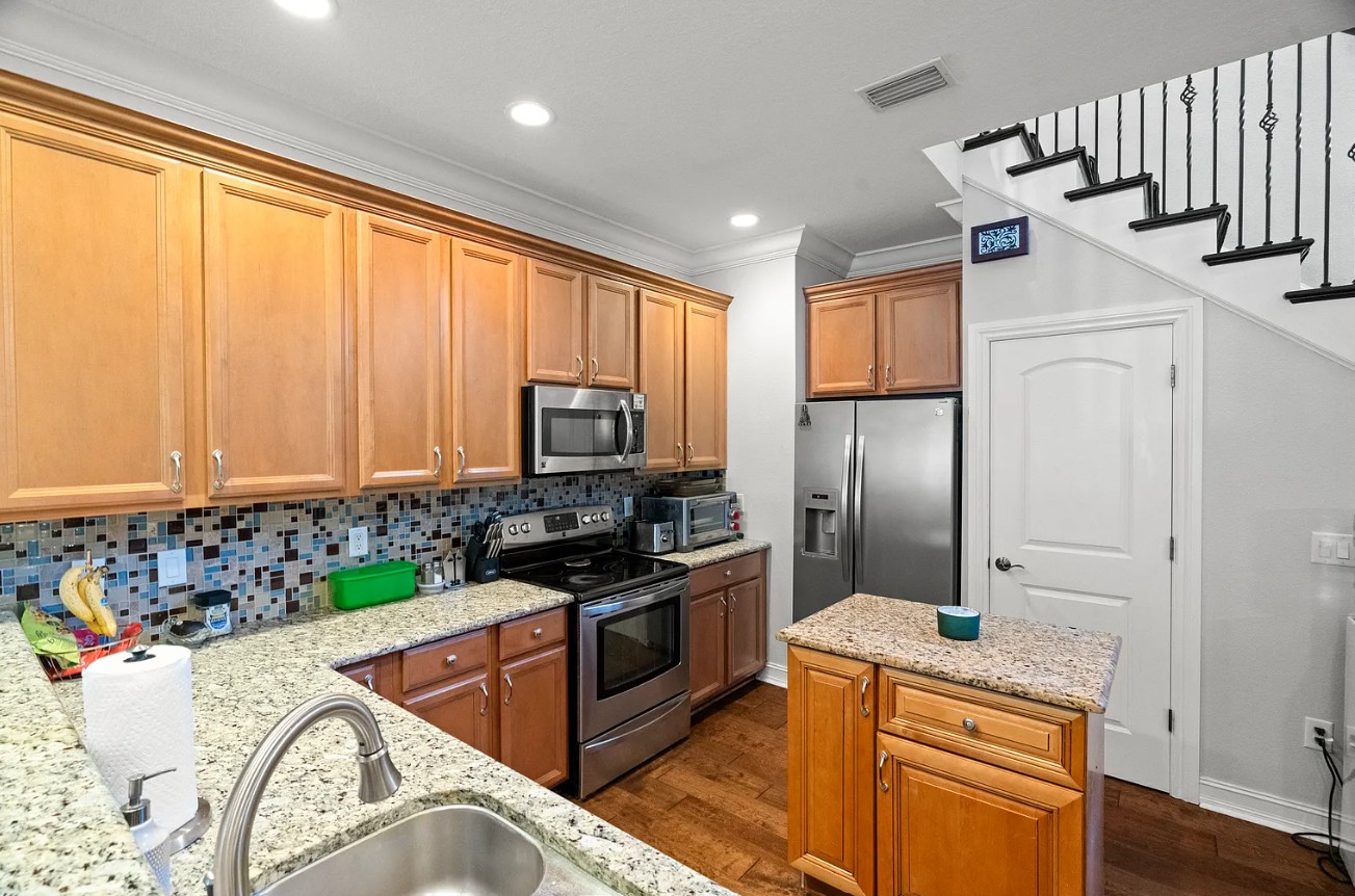 The gourmet kitchen shines with granite countertops, stainless steel appliances, a spacious island, and a well-organized walk in pantry.