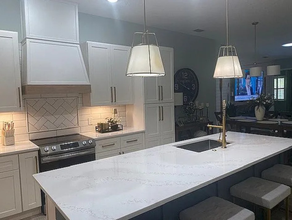 The heart of the home features an open kitchen with white cabinets and quartz countertops, a large center island, custom-built range hood, and a generous walk-in pantry for extra storage.