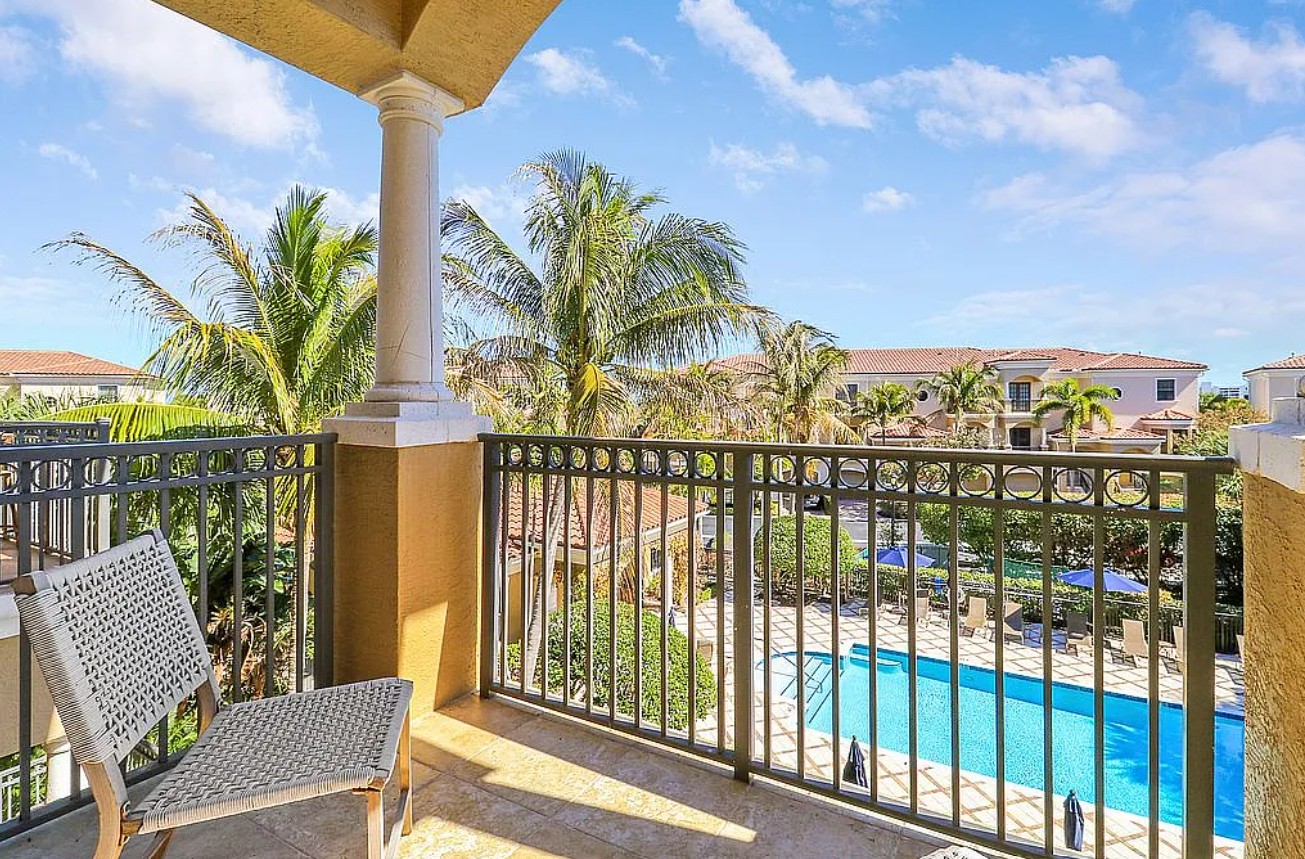 The third floor includes a luxurious primary suite with four closets and a covered balcony overlooking the pool, along with an additional en-suite bedroom with private balcony.