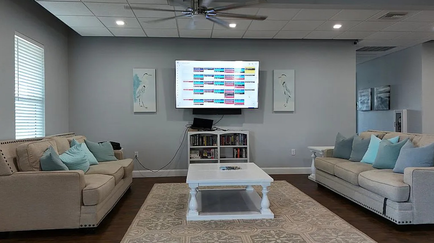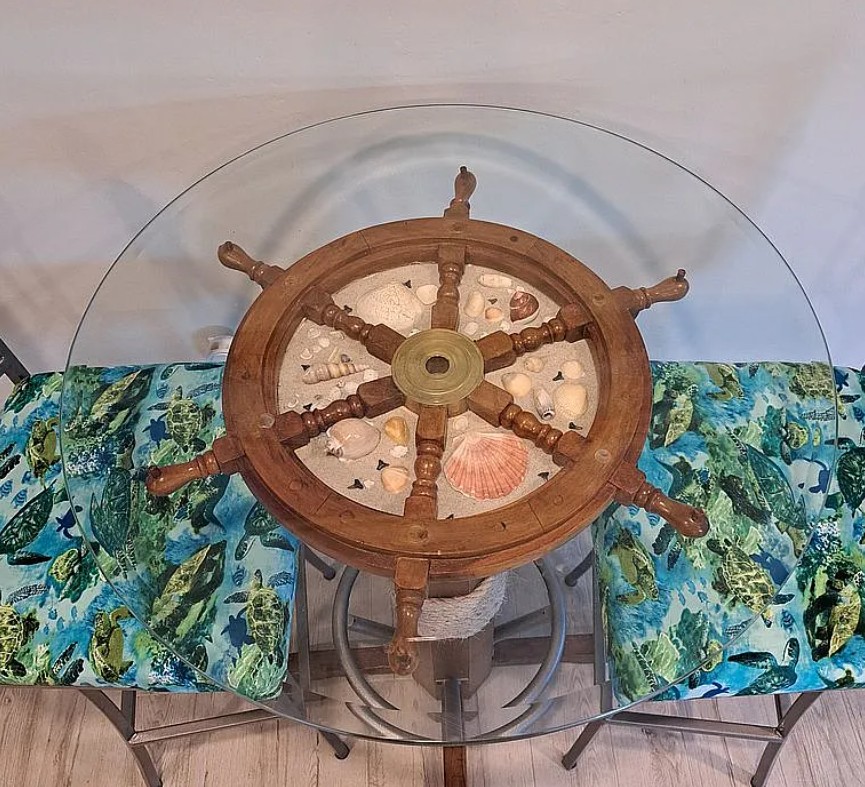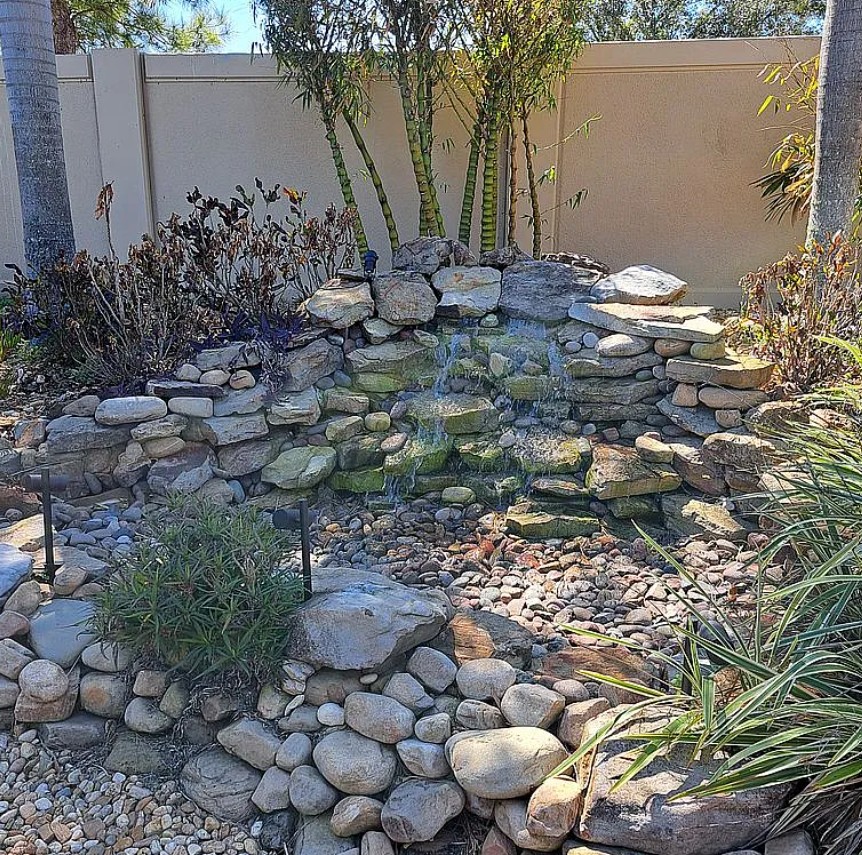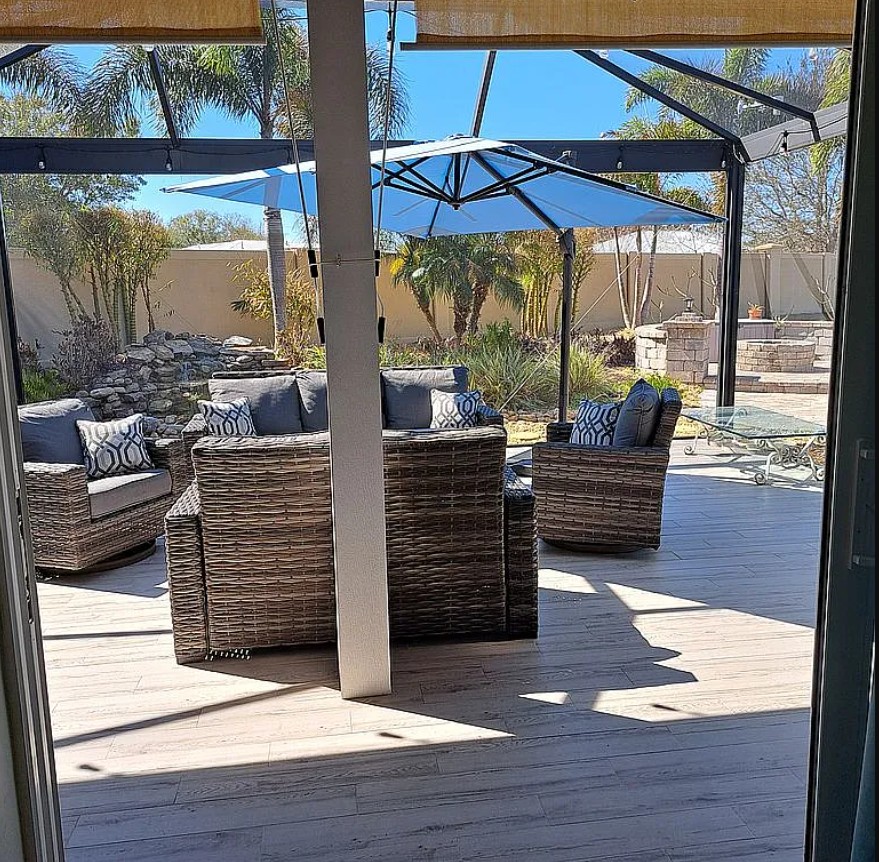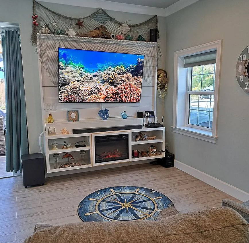 Inside, enjoy a full-size bedroom, airy living area, coastal-inspired furnishings, and a dedicated golf cart garage with the golf cart included. The outdoor space is designed for entertaining and relaxation, featuring a propane fire table, outdoor kitchen with sink, mini fridge, microwave, grill, and 52” TV, plus a private waterfall, large firepit, rock landscaping, and a 9x9 cantilever umbrella. A paver pad with 50-amp RV hookups completes this perfect motorcoach setup.