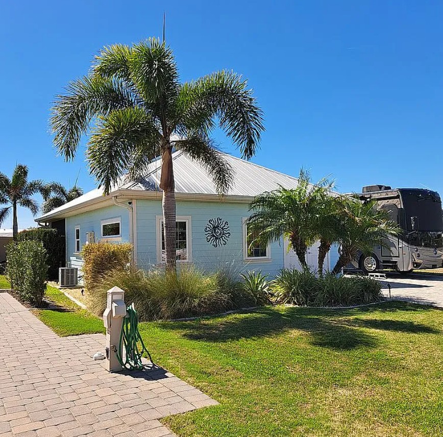 Lot 47 at Thornton Creek Motorcoach Resort, a private, custom-built 1,000 sq ft casita paired with a full RV pad perfect for Florida outdoor living and luxury motorcoach lifestyles. Built in 2019 with concrete block construction, HardiePlank siding, hurricane-impact windows, and a durable metal roof, this 1 bedroom, 1 bath home offers peace of mind, durability, and comfort.
