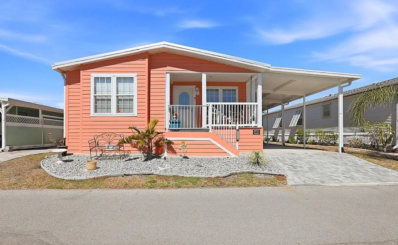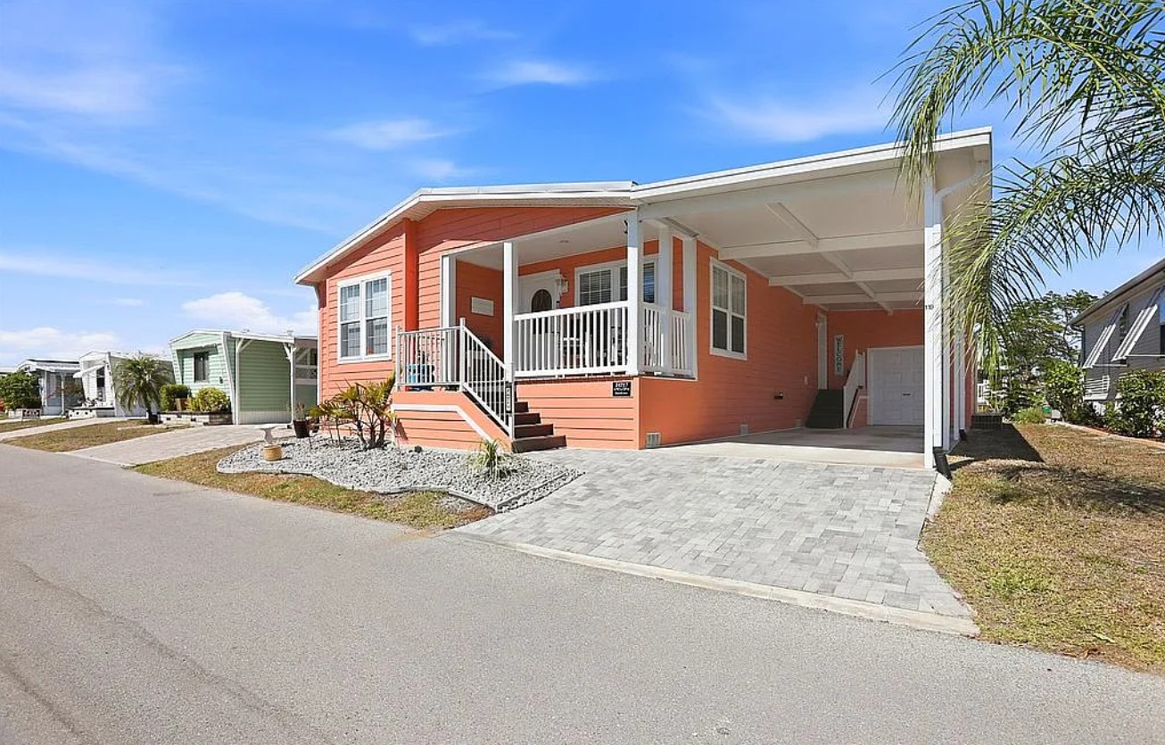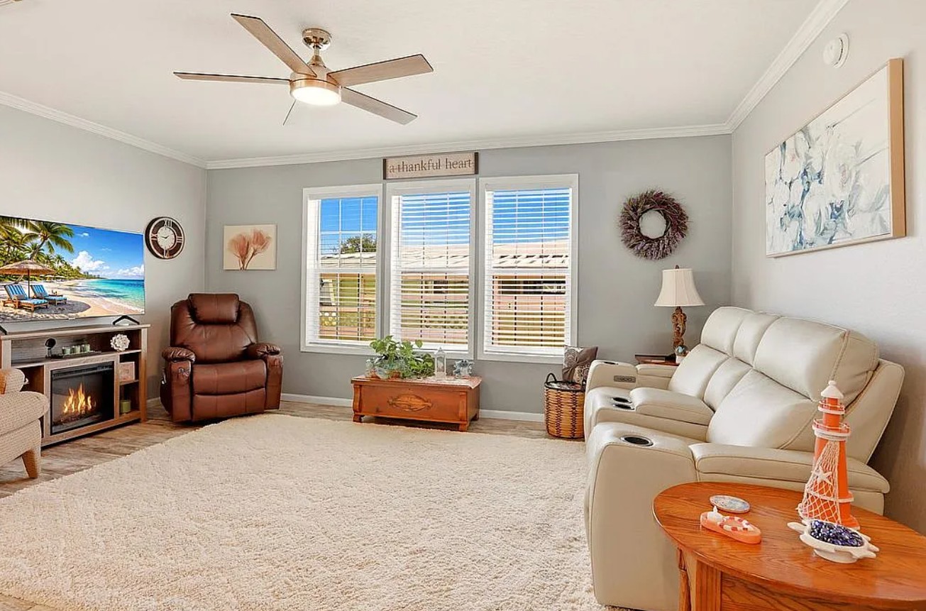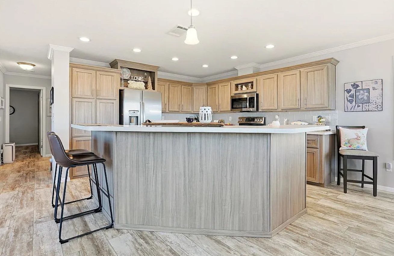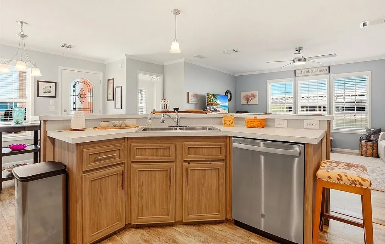 Experience coastal Florida living in this 2023 Jacobson double-wide home located in the desirable Harbor View on The Bay 55+ community. Offering 1,568 sq ft, this 3 bedroom, 2 bathroom home features elegant crown molding, stainless steel appliances, center kitchen island with bar seating, and an inside laundry room for added convenience.