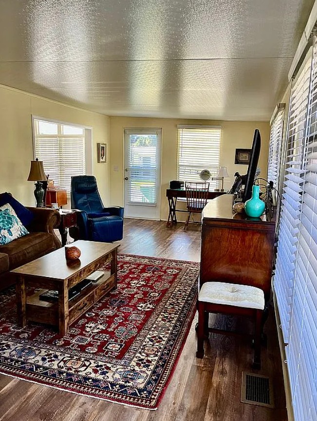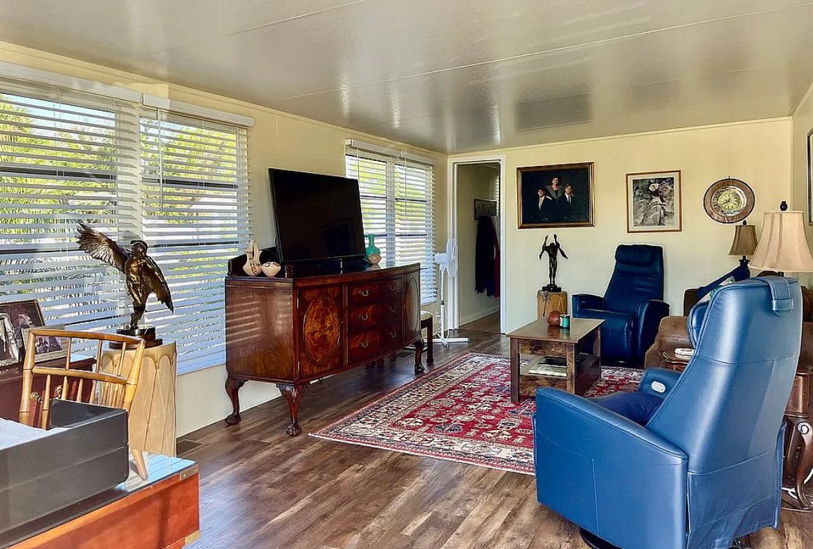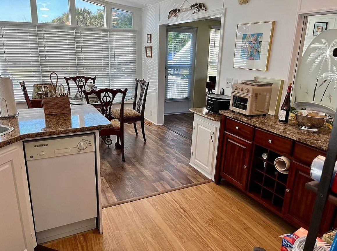 Situated on a spacious corner lot with peaceful woodland views, this well-maintained home features a flexible floor plan with potential to convert to a 2 bedroom layout if desired. The large indoor laundry room includes a washer and dryer and provides generous additional storage. A spacious storage shed offers even more room and includes clear hurricane panels, while clam shell awnings protect the remaining windows. The home is being sold partially furnished, making it move-in ready.