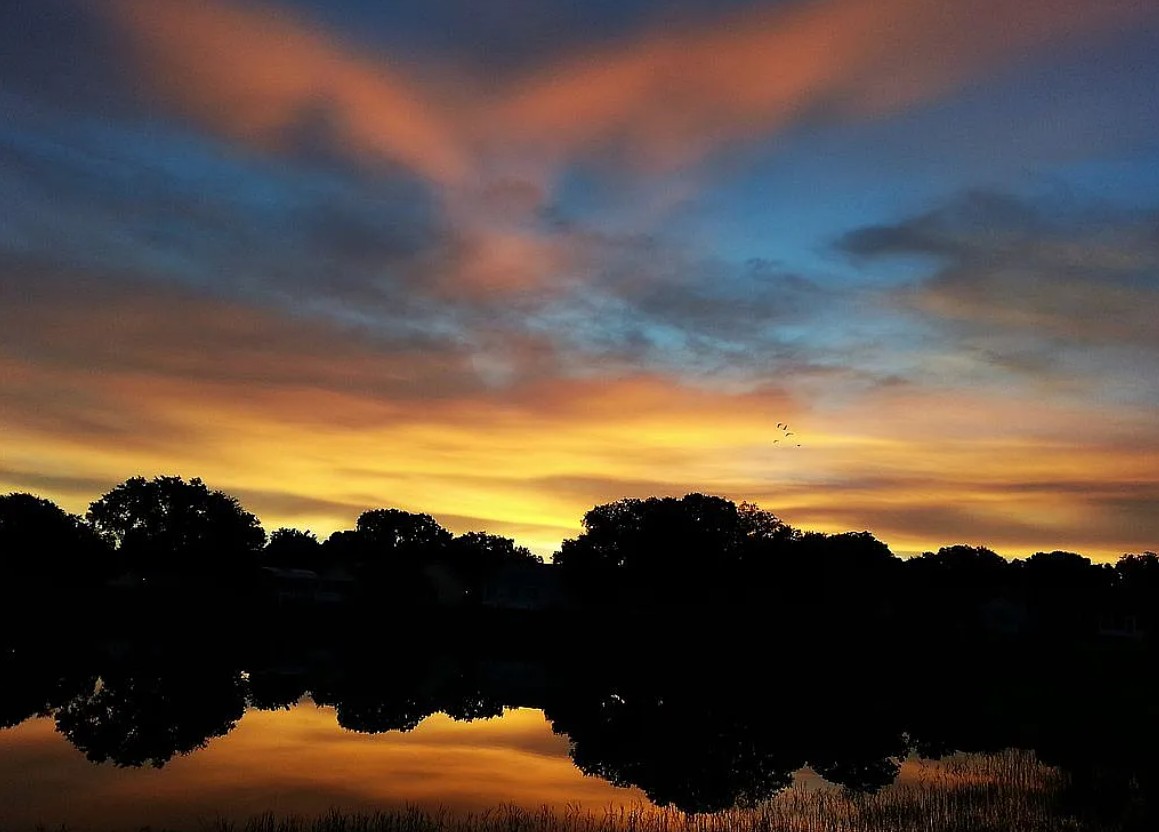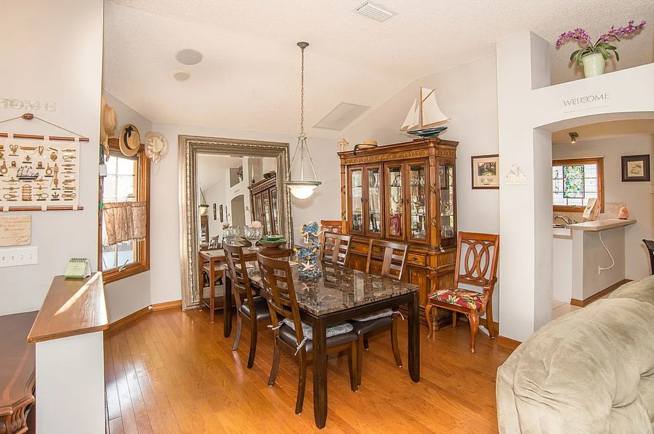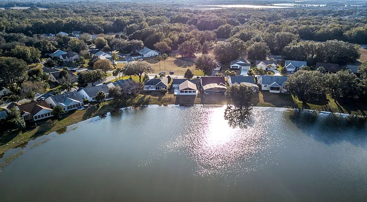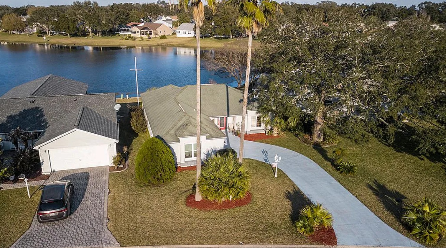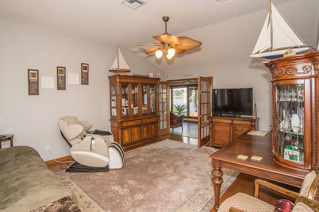 Expanded designer waterfront home for sale by owner in the highly sought-after Village of Mira Mesa in Lady Lake, offering rare natural privacy, an oversized lot, and open water views of Lake Laguna, a large spring-fed pond where fishing and kayaking are allowed. This 3 bedroom, 2 bath home features an expanded floor plan with a fully enclosed 10x24 sunroom showcasing custom wood Andersen windows, heat and AC, and breathtaking east-facing sunrise and moonrise views over the water.