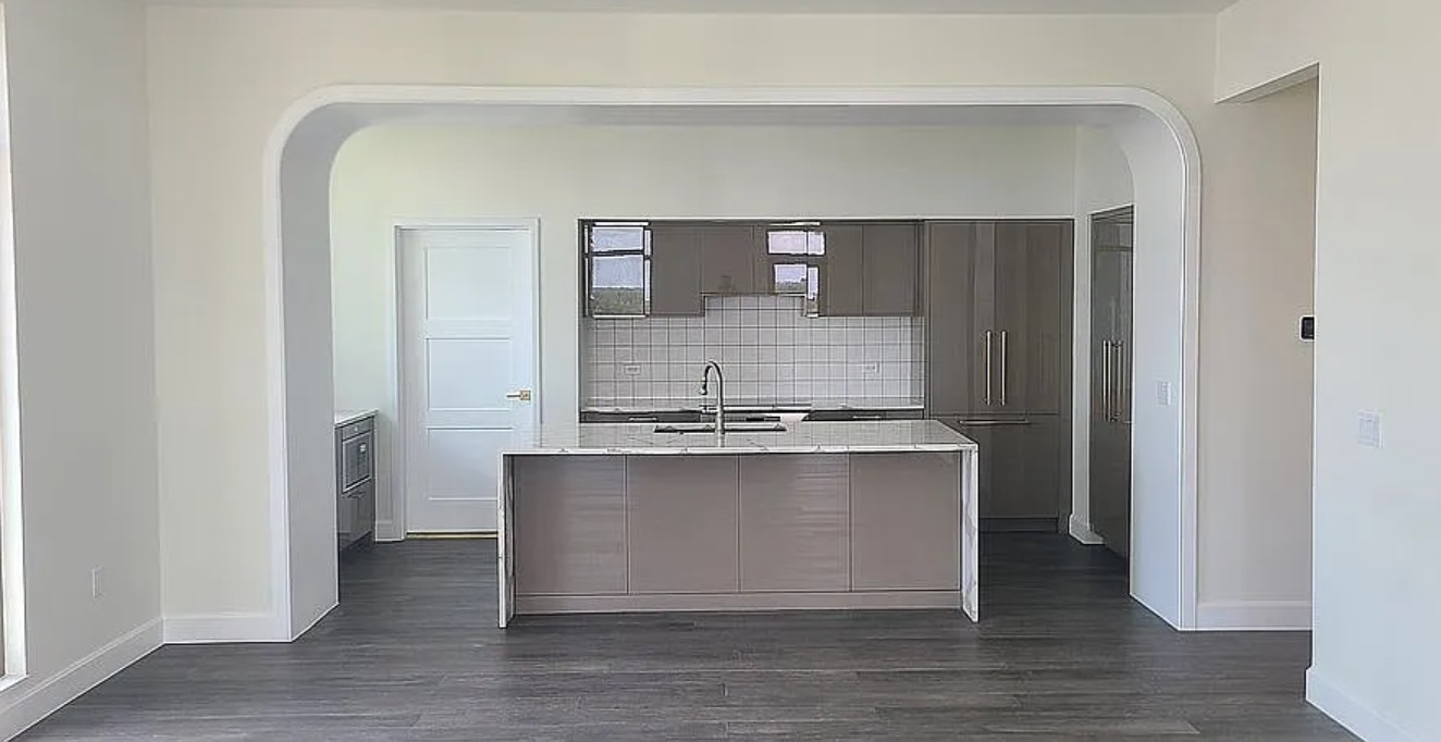 The gourmet kitchen is designed for both everyday living and entertaining, featuring sleek paneled European cabinetry, quartz countertops with waterfall edges, and a large island. A full Thermador appliance package includes a cabinet-panel refrigerator and freezer, induction cooktop, integrated hood, microwave/convection oven, dishwasher, and a climate-controlled wine fridge. Additional kitchen highlights include an impact-resistant granite farmhouse sink and premium Brizo plumbing fixtures.