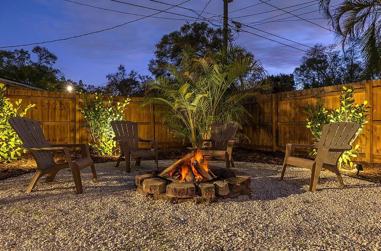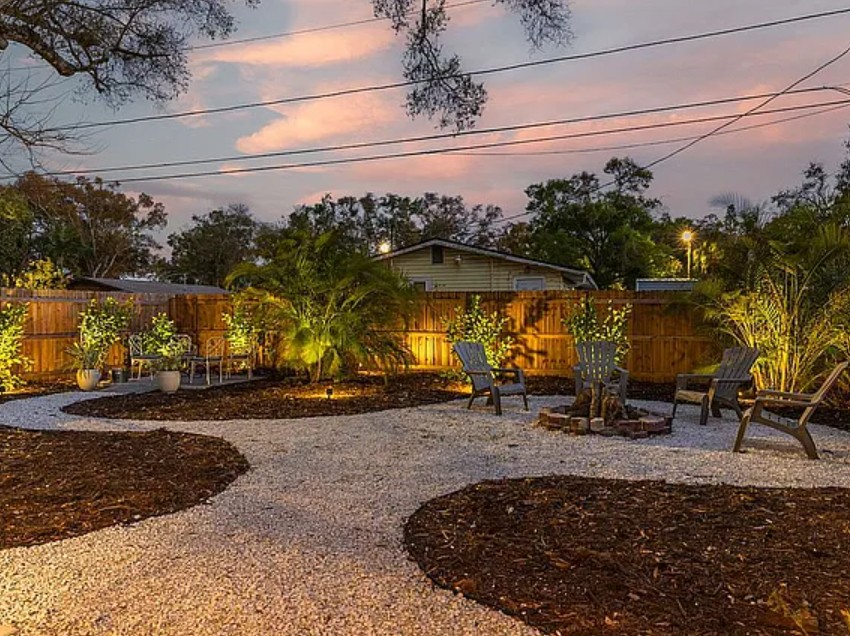 Step outside to enjoy a beautifully designed backyard oasis perfect for relaxing or entertaining. The outdoor space features winding garden pathways, lush tropical landscaping, and a cozy fire pit seating area ideal for evening gatherings. An additional patio seating area offers even more room to unwind, while ambient landscape lighting creates a peaceful and inviting nighttime atmosphere.