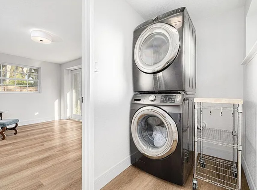 A dedicated indoor laundry area with stacked washer and dryer adds convenience, while a versatile bonus space with French doors provides direct access to the backyard and can easily serve as a home office, hobby room, or additional lounge area.