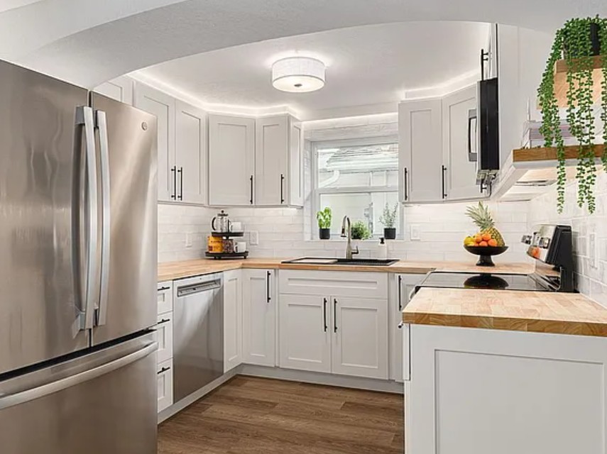 The fully renovated kitchen is a standout feature, designed with both style and functionality in mind. It includes sleek shaker cabinetry, butcher-block countertops, a classic subway tile backsplash, stainless steel appliances, and modern open shelving, creating a clean and contemporary cooking space. Additional storage is available with a kitchen pantry, hallway linen closet, and a generously sized attic.