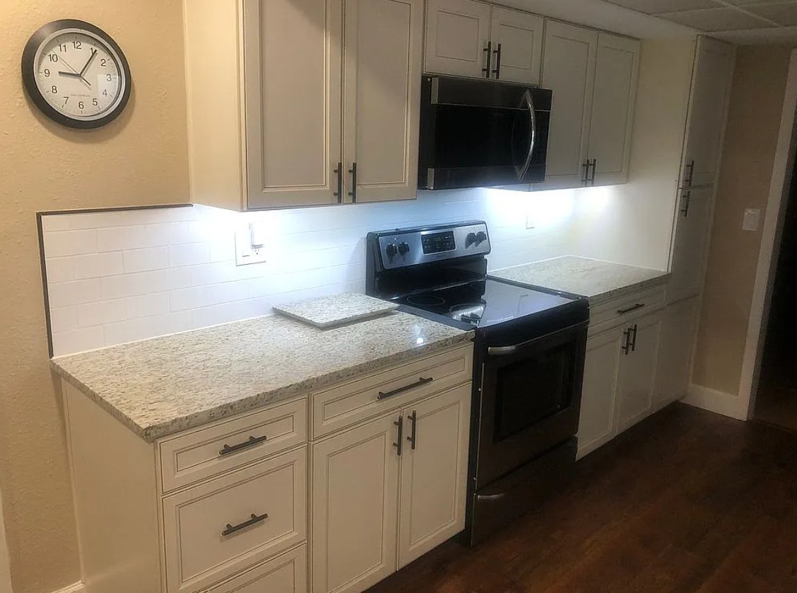 This beautifully updated 4 bedroom, 2 bathroom home in Mount Dora, Florida, features a spacious split-bedroom floor plan with the master suite on one side and three additional bedrooms on the other, offering privacy and comfort for families. The very newly remodeled kitchen includes all white cabinets, granite countertops, a deep double sink, white tile backsplash, and modern recessed lighting perfect for cooking and entertaining.