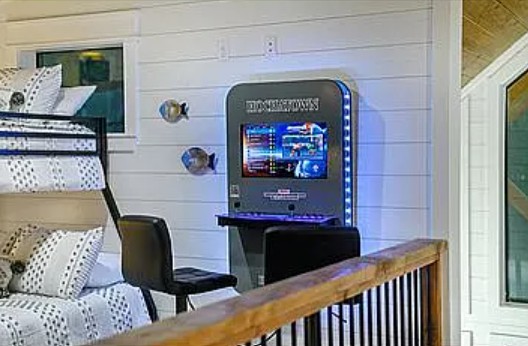 The home features two primary suites with private en suite baths, including an upstairs master with a private balcony. A loft area includes twin-over-full bunk beds, a half bath, and a wall-mounted arcade perfect for guests or entertaining.