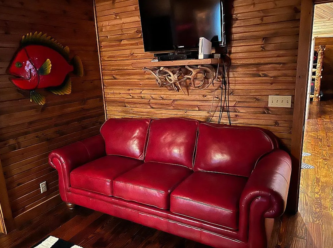 The property features a large enclosed 2 slip boat dock, a spacious swimming dock, and direct water access for boating and recreation. Inside, the home is uniquely decorated with custom furnishings and offers a true lodge style feel, with partial furnishings included.