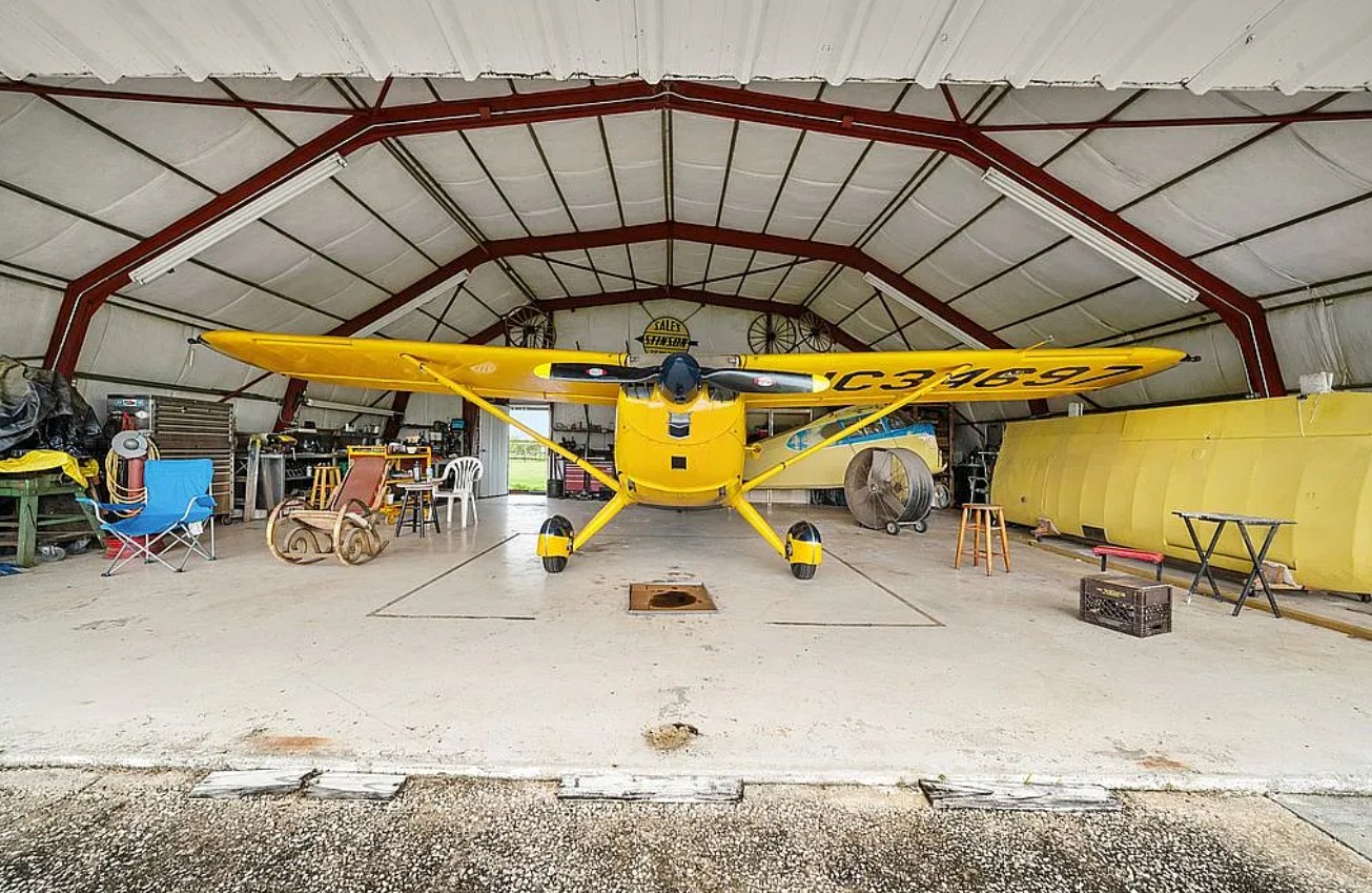 A true standout feature is the inclusion of two insulated airplane hangars positioned alongside a 2,000 ft grass runway (owner agreement required), with space for up to 4–5 small aircraft. The hangars are equipped with 220V electric, airline hookups for tools, and include an air-conditioned workshop and office ideal for aviation enthusiasts, mechanics, or hobbyists.
