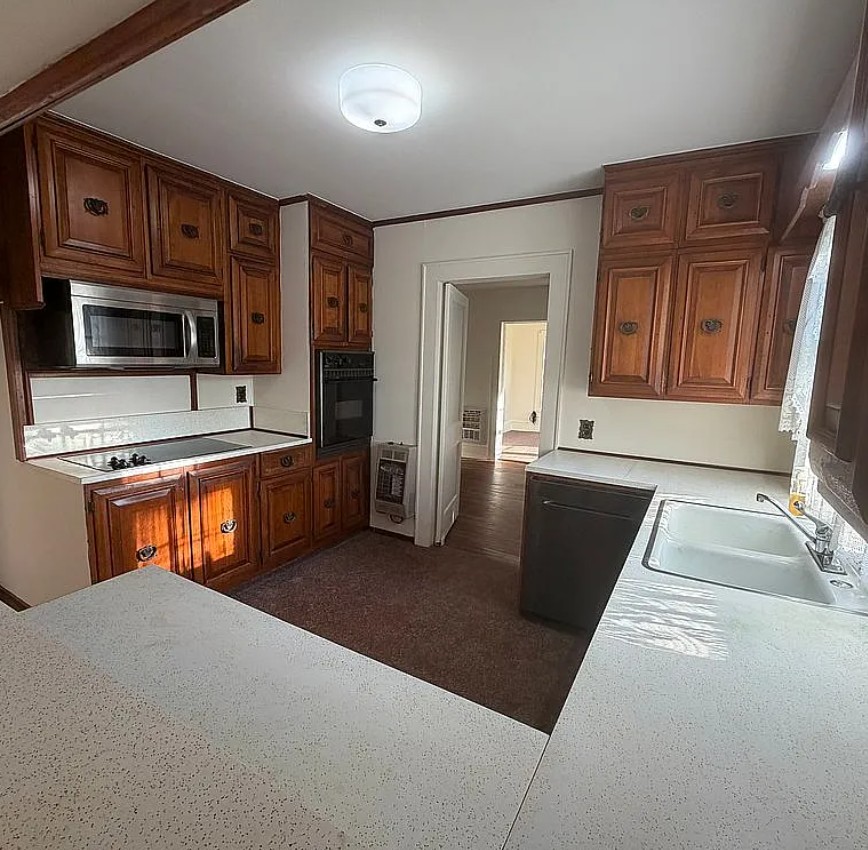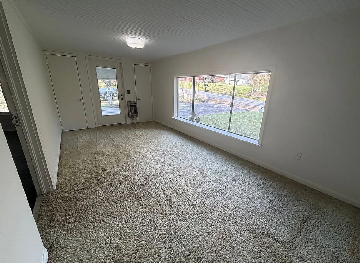Inside, you’ll find a large family den with an adjacent breakfast room, a formal dining room, and a comfortable living area. Several areas feature newly installed carpet, including the den, breakfast room, utility room, kitchen, half bath, and one bedroom. In other rooms, the carpet has been removed to reveal stunning original oak hardwood flooring from the home’s 1940 build, along with vintage details like crystal glass doorknobs.