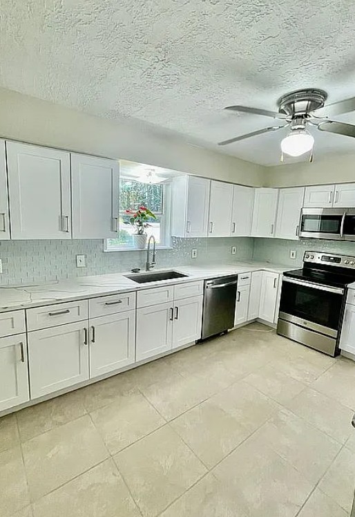 The interior showcases white cabinetry, Carrera quartz countertops in the kitchen and bathrooms, soft-close drawers, a lazy Susan, and a stainless steel farmhouse sink with pull-down faucet. All travertine flooring runs throughout the home, complemented by new windows, fresh exterior paint, and updated insulation. Major systems include a newer roof and an A/C unit less than five years old.