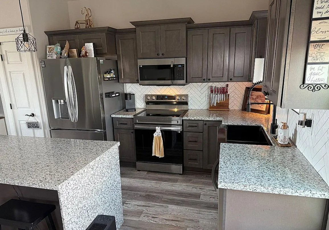 Inside, the inviting open-concept floorplan features a modern kitchen with a stunning granite waterfall island, stainless steel farmhouse sink, matte black fixtures, and ample cabinetry. Stainless steel appliances, a spacious pantry, and a built-in water softener enhance both style and convenience. The bright living area flows seamlessly to a full laundry/mudroom that connects directly to the attached garage.