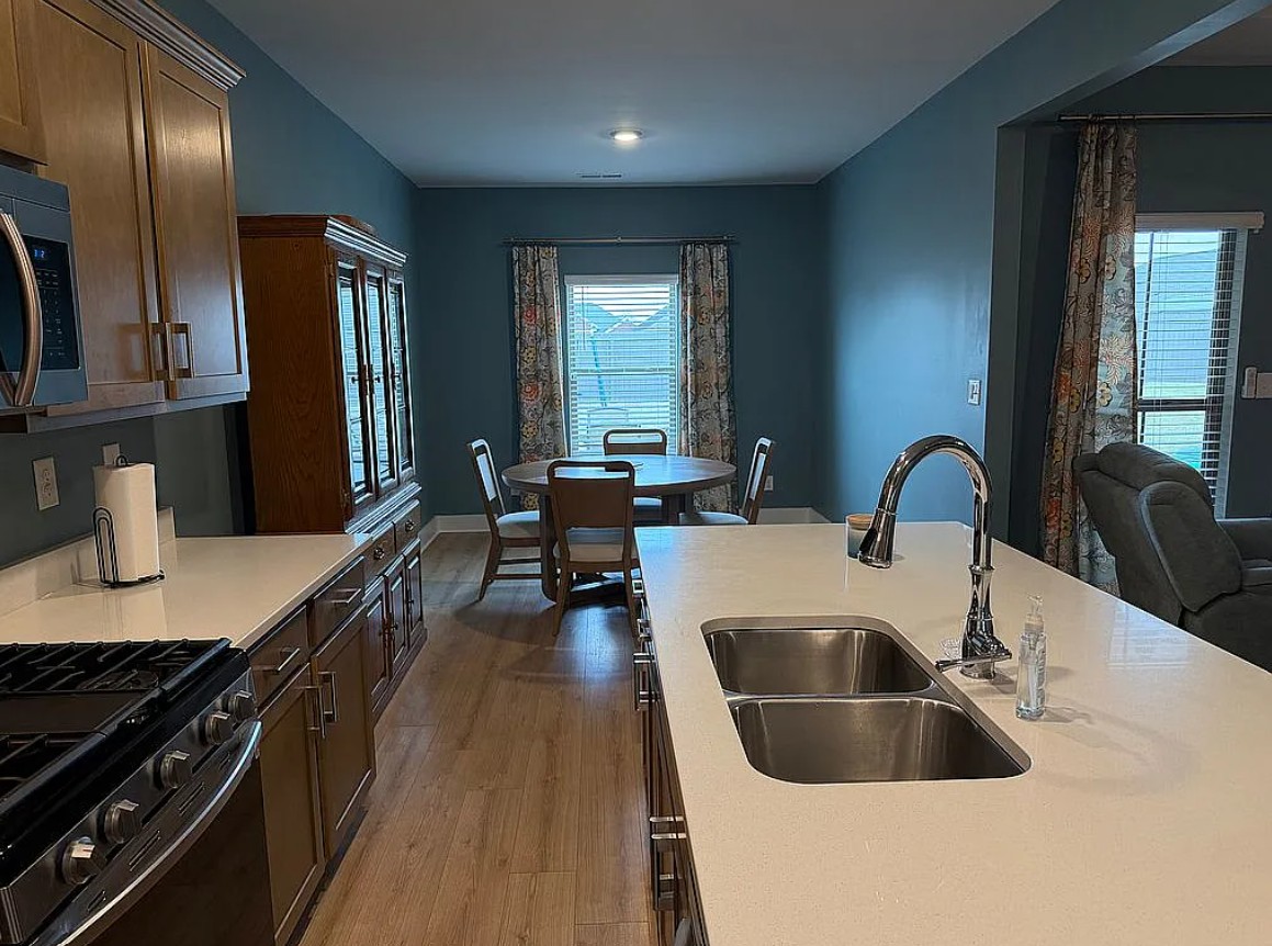 The open floor plan creates a welcoming atmosphere, with a spacious kitchen featuring an oversized island, gas stove, walk-in pantry, ample cabinetry, and beautiful quartz countertops throughout. The kitchen flows seamlessly into the living area, making it perfect for both everyday living and entertaining.
