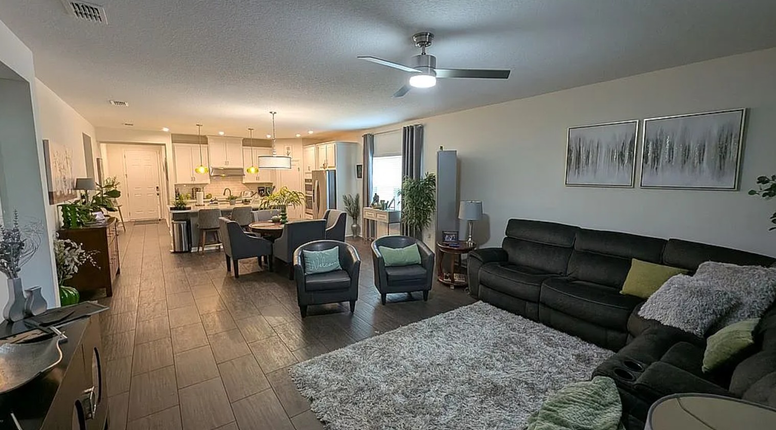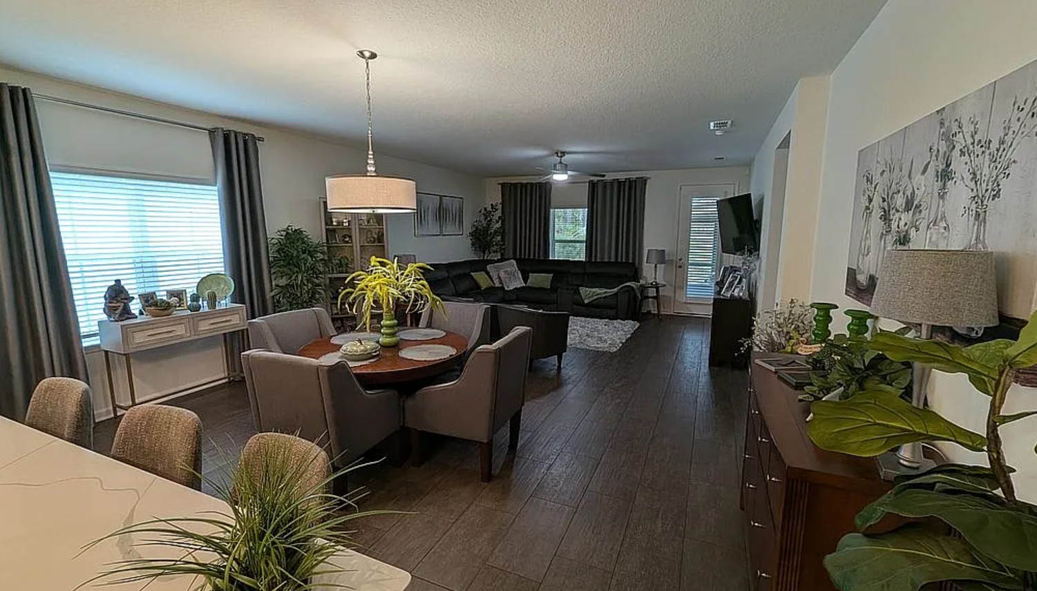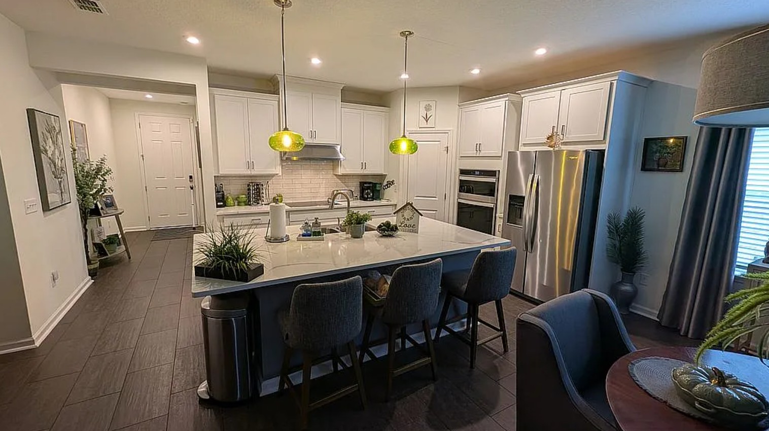 Move in ready and built in 2022, this stunning 4 bedroom, 2 bathroom home in Middleburg, FL offers the perfect blend of modern design, thoughtful upgrades, and peaceful surroundings. From the moment you arrive, you’ll notice the manicured lawn and custom concrete curbing that enhance the home’s curb appeal. Inside, 9 foot ceilings, durable ceramic tile flooring in the main living areas, and upgraded carpet in the bedrooms create a bright and comfortable living space. The open-concept layout is centered around an upgraded gourmet kitchen featuring 40 inch cabinets, level 7 quartz countertops, a textured tile backsplash, flush-mount LED lighting, and premium stainless Whirlpool appliances, including a high-end induction cooktop and convection microwave, all flowing seamlessly into a spacious family gathering room.