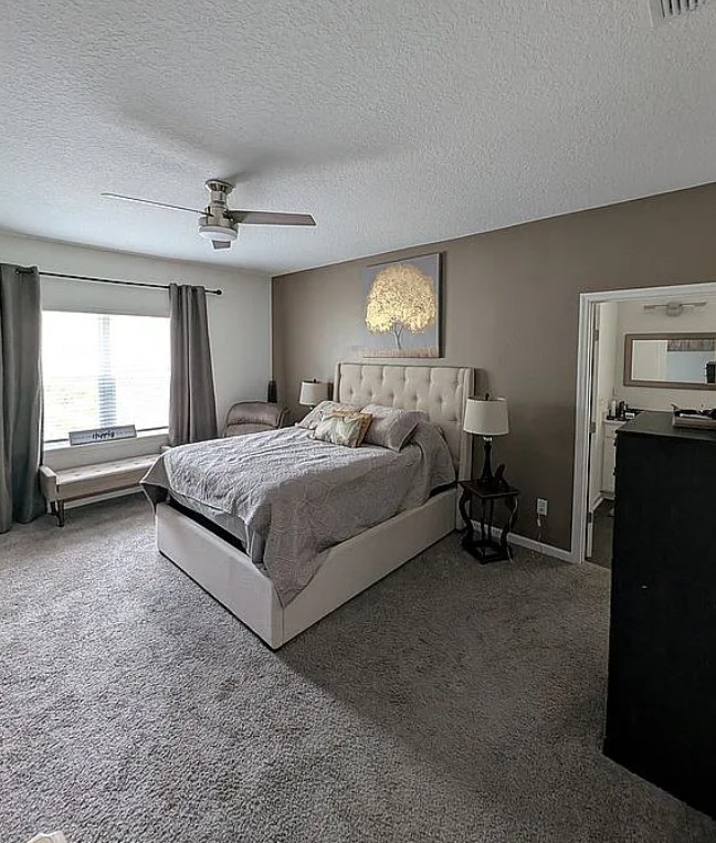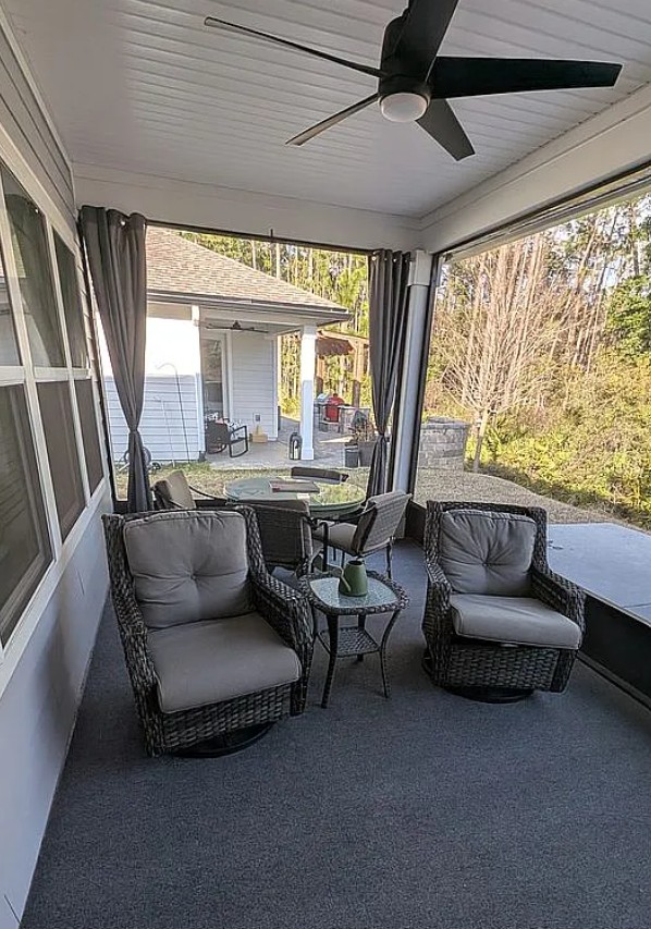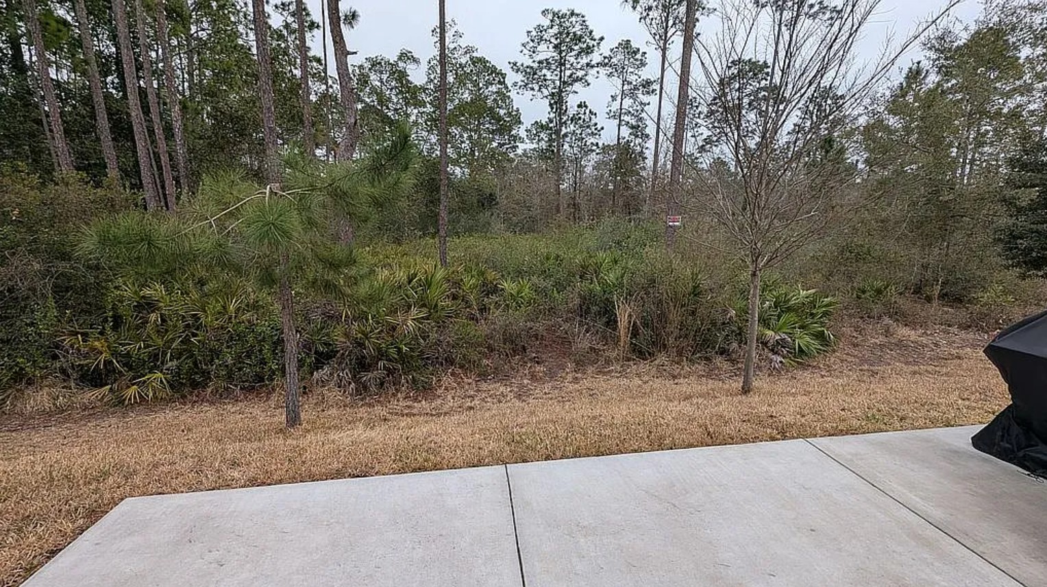The primary suite serves as a private retreat with a tiled walk-in shower and bench seat, dual quartz vanities, two large walk-in closets, and a separate water closet. Step outside to enjoy a fully screened lanai with ceiling fan that opens to a 20x20 concrete patio overlooking a private preserve, offering serene North Florida nature views and peaceful mornings. Additional features include an energy efficient 15 SEER HVAC system, electric water heater, seamless gutters, fresh Sherwin-Williams interior paint, upgraded ceiling fans and lighting fixtures, and 2 inch faux wood blinds throughout. The spacious 2 car garage doubles as a climate-controlled flex space with a 4th generation mini-split AC/heat unit, while the widened driveway allows for multiple vehicles and golf cart parking.