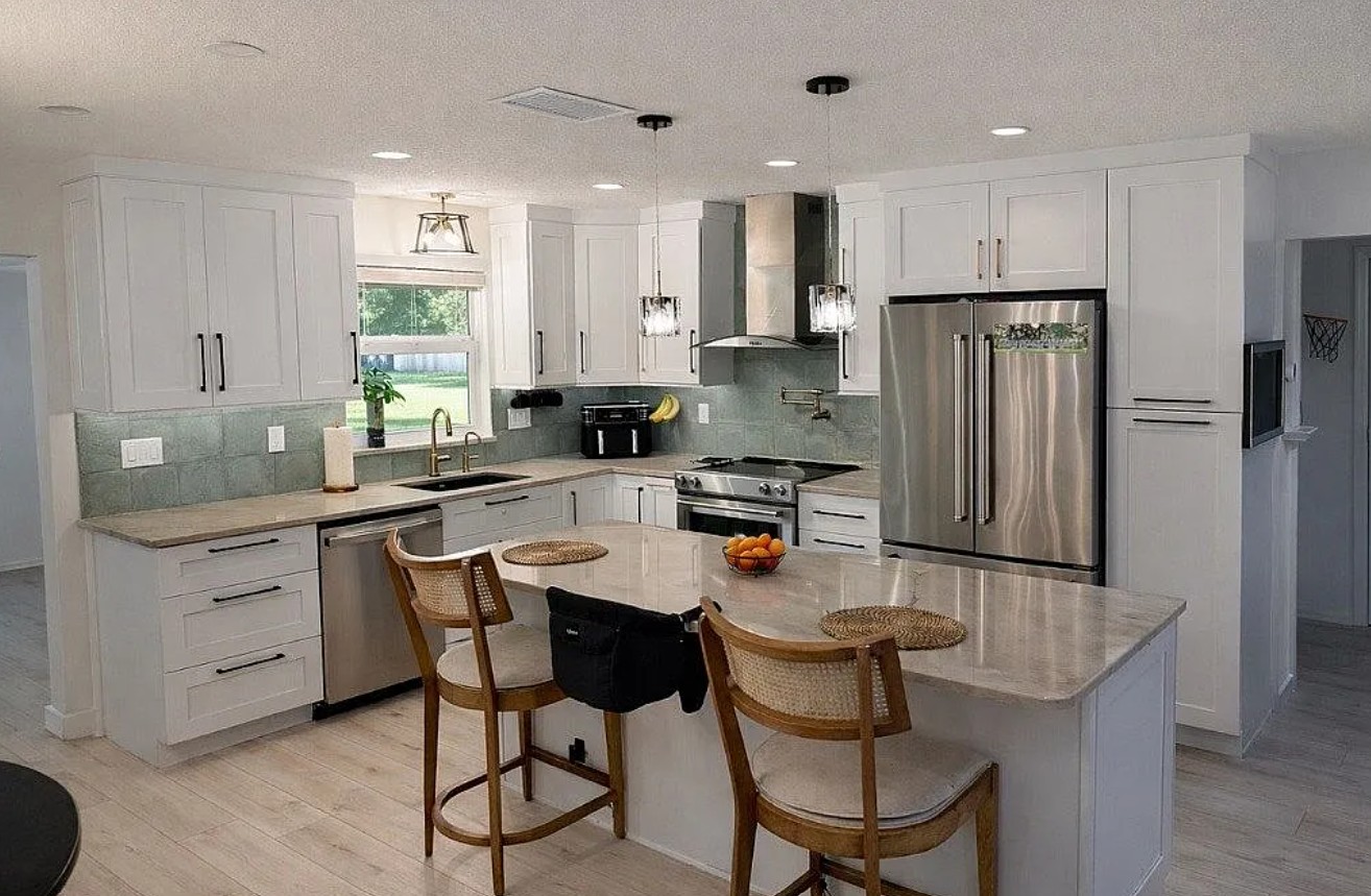 The renovated kitchen is designed for both function and gathering, showcasing wood cabinetry, stainless steel appliances, and a spacious island, along with premium touches like a pot filler and hot water tap.