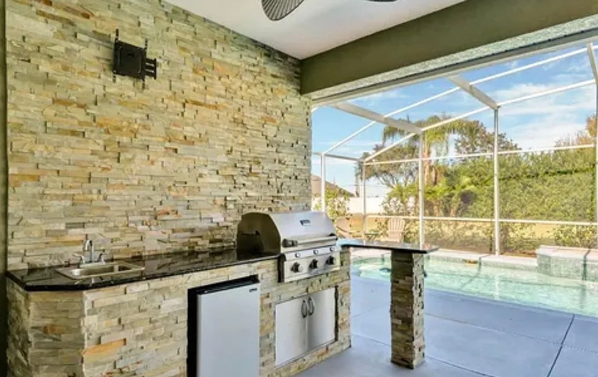 The home features a screened in patio and pool area with large sliding doors that open fully, creating a seamless transition between indoor and outdoor spaces perfect for entertaining guests or enjoying year-round sunshine.