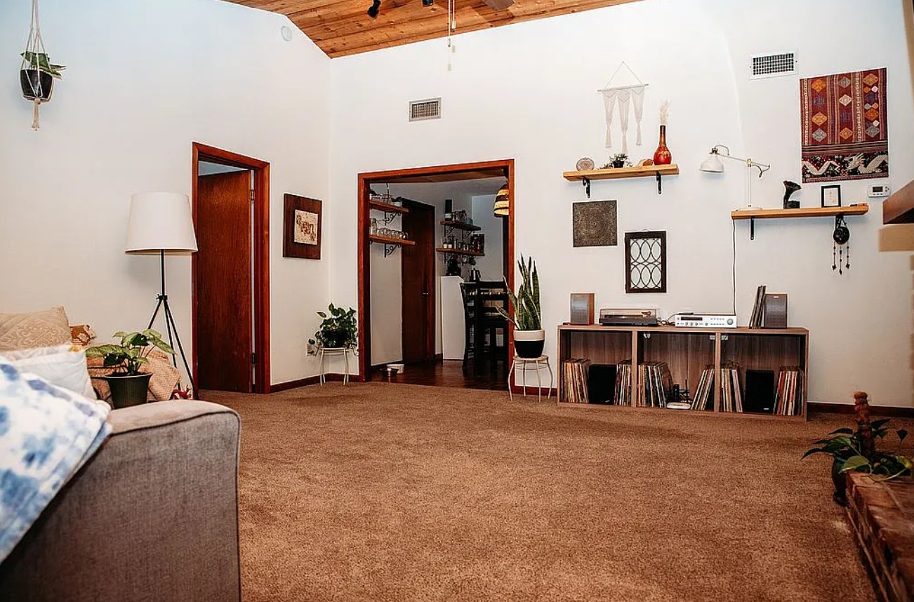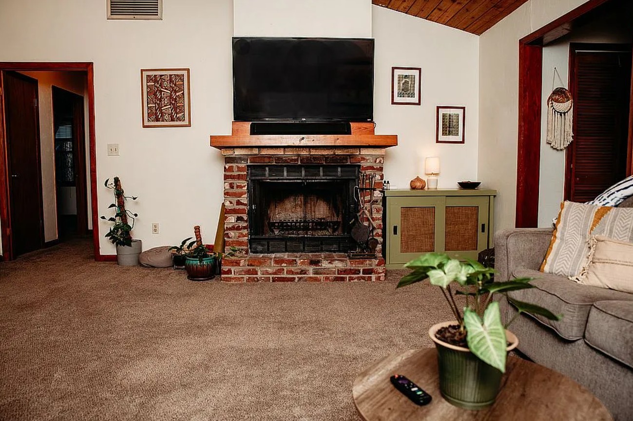 Inside, the home features high ceilings that create a bright, open feel, along with a cozy fireplace perfect for relaxing evenings. The spacious layout provides comfort and charm with a unique cabin style atmosphere.