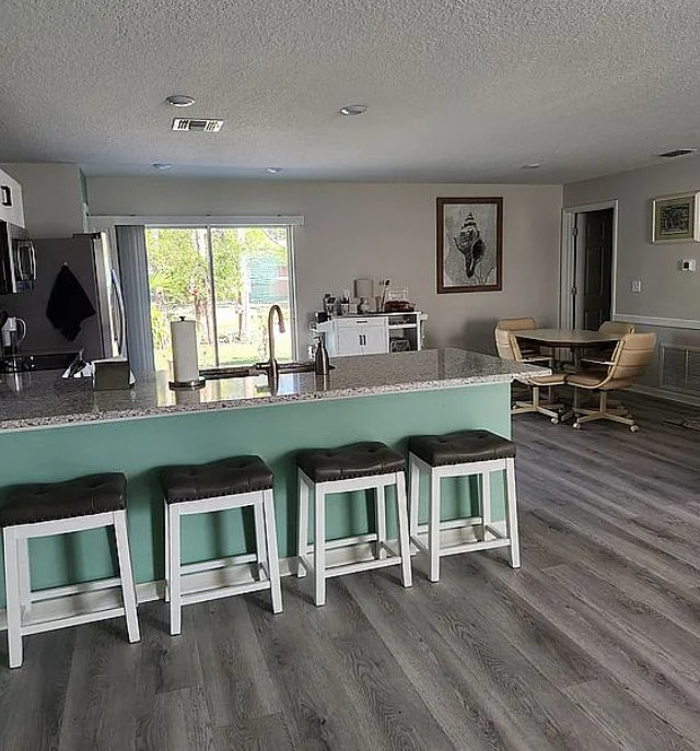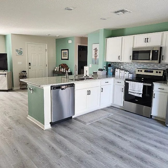 Inside, the home includes vinyl plank flooring throughout the main living areas, bathrooms, and laundry room, along with elegant quartz countertops that add a modern touch to the kitchen. A large laundry room provides extra convenience and storage space.