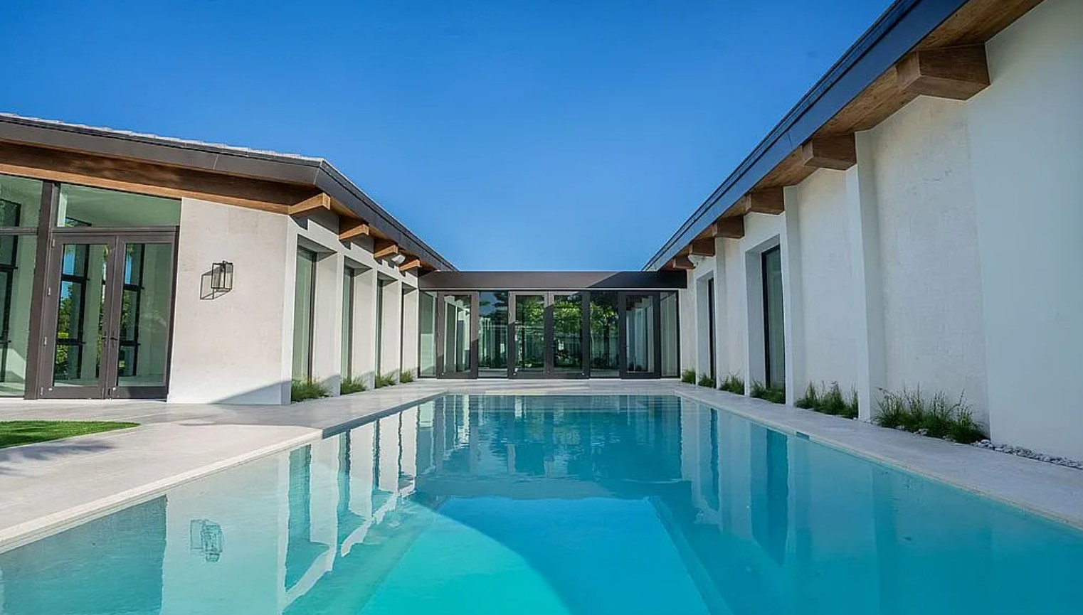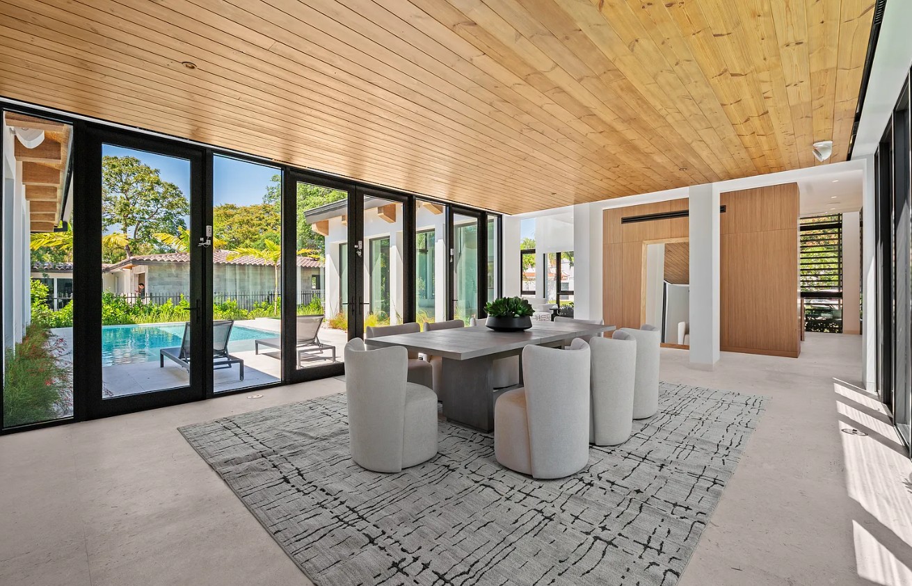 The home features high ceilings, expansive glass walls that fill the space with natural light, and sleek wood detailing that enhances its modern aesthetic. A serene pool area provides the perfect private oasis for relaxing or entertaining, surrounded by professionally landscaped grounds.