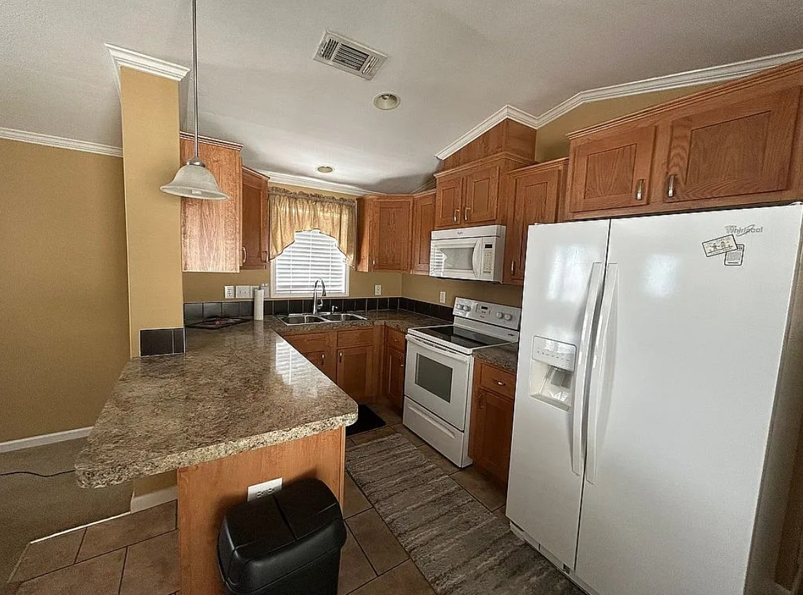 The kitchen features ample cabinet and countertop space, matching Whirlpool appliances, and a seamless flow into the living area, making it ideal for everyday living and entertaining. The spacious primary bedroom easily accommodates a king-size bed and includes a private en suite bathroom for added comfort.