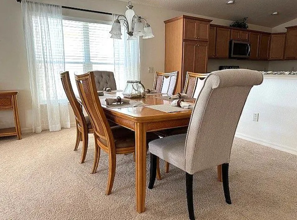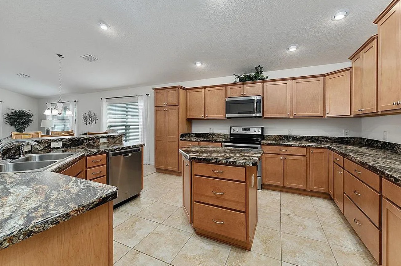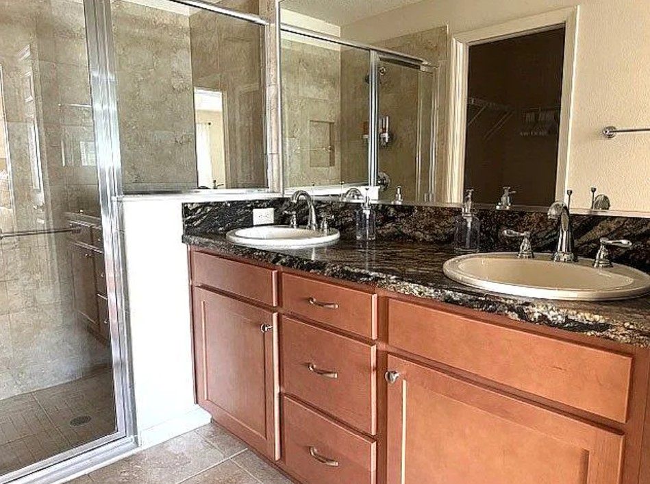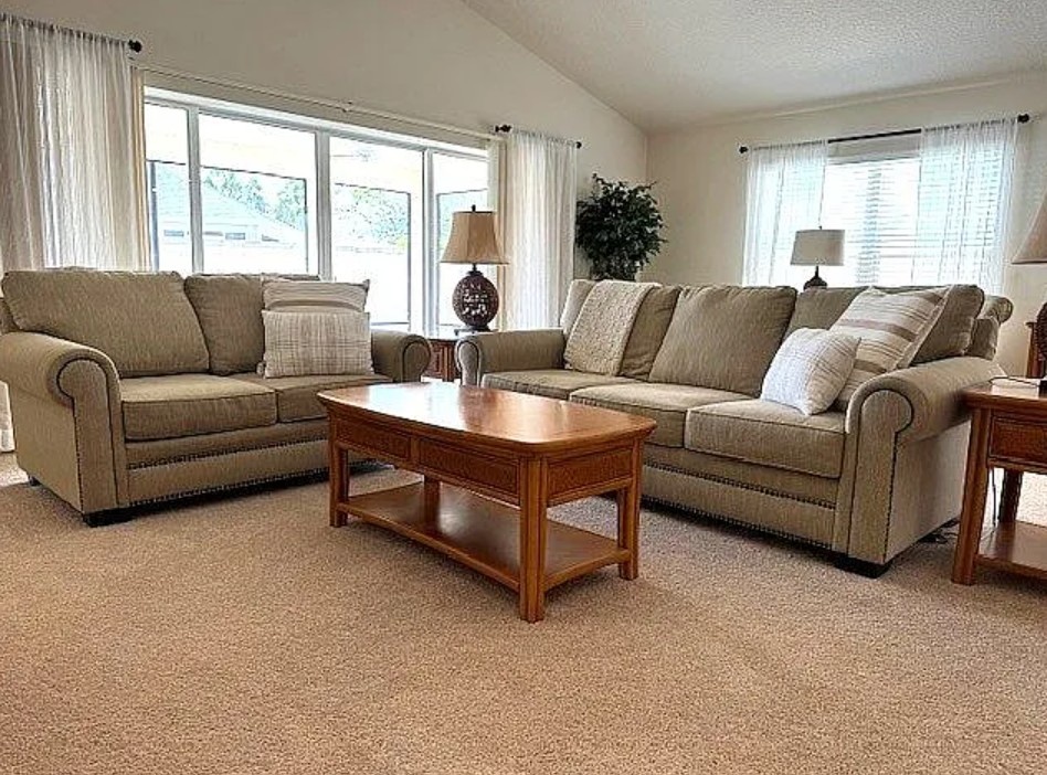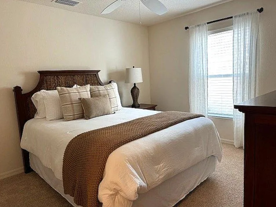 The spacious open-concept layout seamlessly connects the living, dining, and kitchen areas, creating an ideal space for entertaining and everyday living. The primary suite includes a king-size bedroom set, double sinks, a tiled walk-in shower, and a large walk-in closet. Two additional guest bedrooms are furnished with queen-size sets, feature large closets, and share a well-appointed second bathroom.