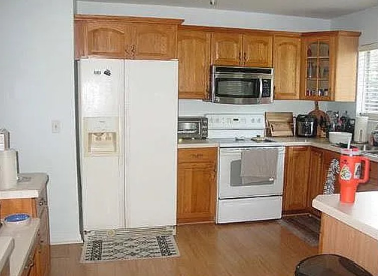 Inside, the home features a functional layout with updated flooring throughout, including luxury vinyl plank in two bedrooms, tile in the third bedroom, and wood veneer flooring in main living areas. The kitchen includes well-maintained oak cabinets and a new microwave, combining practicality with charm.