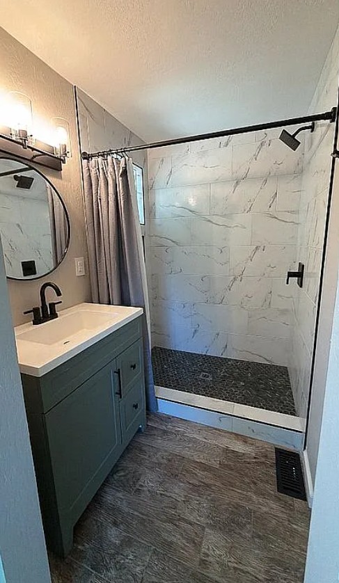 Flooring has been thoughtfully upgraded with wood-look tile in main living areas and bathrooms, laminate flooring in the primary and secondary bedrooms, and new carpet in the guest room. Both bathrooms have been completely renovated, including a modern tiled walk-in shower in the primary suite and a new tub, vanity, and fixtures in the guest bath.