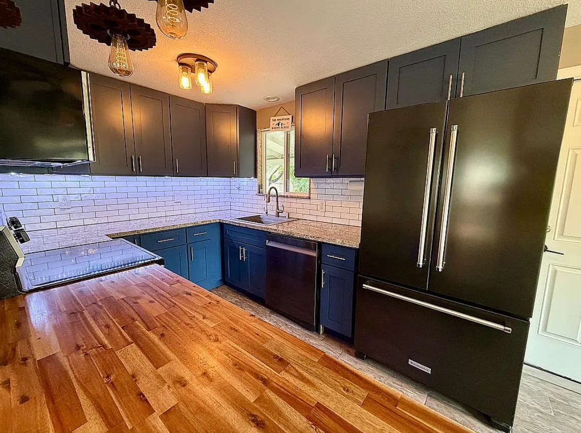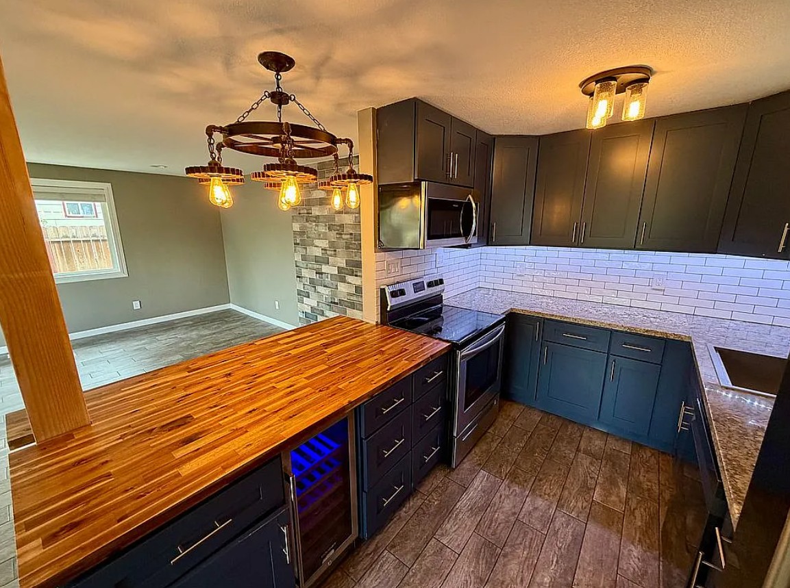 Inside, you’ll find a fully remodeled kitchen with new cabinetry, abundant granite countertops, a large sink, and upgraded appliances including a wine refrigerator, microwave, and electric range (with gas available). A butcher block countertop with bar seating opens to the living area, creating an ideal space for entertaining. The home also features all-new windows, trim, paint (interior and exterior), doors, baseboards, and updated lighting throughout.