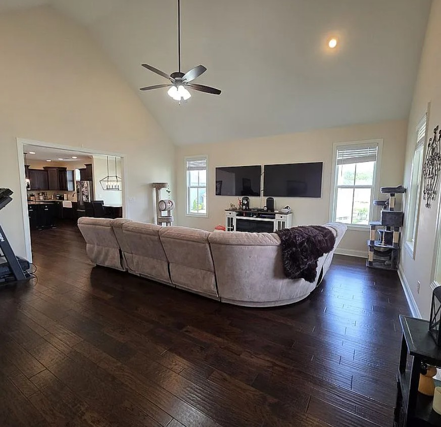 Step inside to a dramatic vaulted living room filled with natural light and flexible space for relaxing or entertaining. The layout flows seamlessly into a dining area highlighted by a glorious bank of windows and a peaceful borrowed water view, creating a bright and inviting atmosphere.