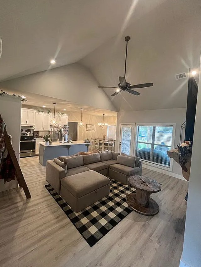 Featuring a spacious open-concept floor plan with soaring vaulted ceilings, the home is filled with natural light and designed for both everyday comfort and entertaining. The stunning kitchen serves as the centerpiece of the home, showcasing crystal quartz countertops, ample cabinetry, and generous workspace, perfect for cooking and gathering.