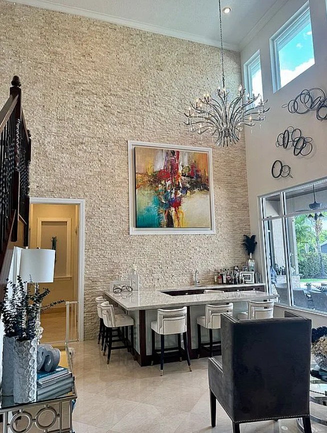 Interior upgrades include impact windows and shutters, marble flooring throughout the first floor, and hardwood flooring on the stairs and second level. The home is enhanced by upscale lighting fixtures, plantation shutters, and crown molding throughout, creating a refined and cohesive aesthetic. A custom bar area with a sink, stone accent wall, and wine cooler adds an elevated touch for entertaining.