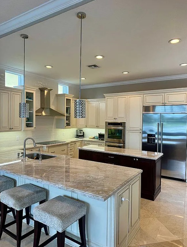 The gourmet kitchen is equipped with a new refrigerator, stainless steel appliances, marble countertops, a water purification system, instant hot water, an induction cooktop, and double convection ovens, along with a built-in microwave in the island and a stainless steel exhaust hood. Additional upgrades include a new air conditioning unit and a new electric water heater.