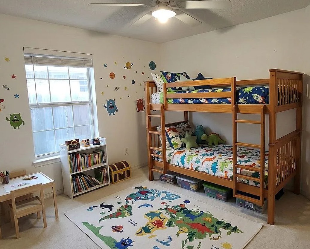 The kitchen includes a breakfast island, full appliance package, and an eat-in dining area, providing both convenience and functionality for everyday living. The split floor plan ensures privacy, with a spacious primary bedroom featuring a ceiling fan and well separated secondary bedrooms.