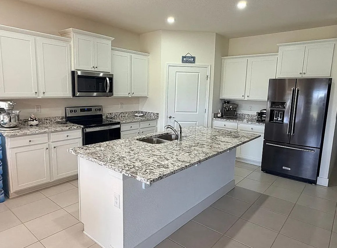 From the moment you enter, you’re welcomed by an open concept floor plan with abundant natural light, LED daylight fixtures, and seamless sight lines that create an airy, inviting atmosphere. The spacious living area flows directly into the kitchen, making it ideal for both entertaining and everyday living. At the heart of the home is a large center island, granite countertops, white cabinetry, stainless steel appliances, and a custom built-in pantry, all designed for both style and functionality.