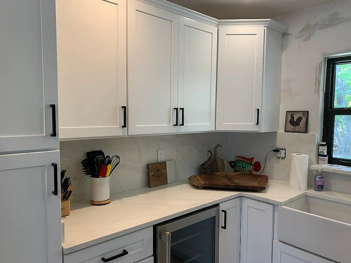The home features a fully remodeled kitchen with new shaker white cabinets, custom quartz countertops, a porcelain farmhouse sink, a large island with a five-burner gas cooktop, and a ceiling mounted vent hood, creating a modern and functional cooking space. Major system upgrades include new PVC plumbing replacing old cast iron pipes, a new metal roof installed within the last 6 months, and upgraded HVAC with mini-split systems for independent room climate control.