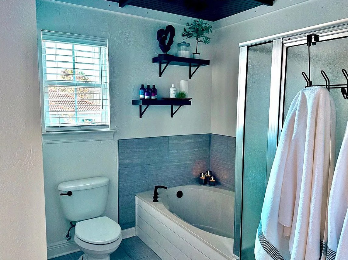 Inside, the home features a bright open-concept floor plan filled with natural light, enhanced by fresh designer interior paint and durable waterproof luxury vinyl plank flooring throughout the main living areas. A welcoming shiplap entry sets the tone for the home’s coastal style, while new modern lighting fixtures elevate the space with a clean, contemporary feel.
